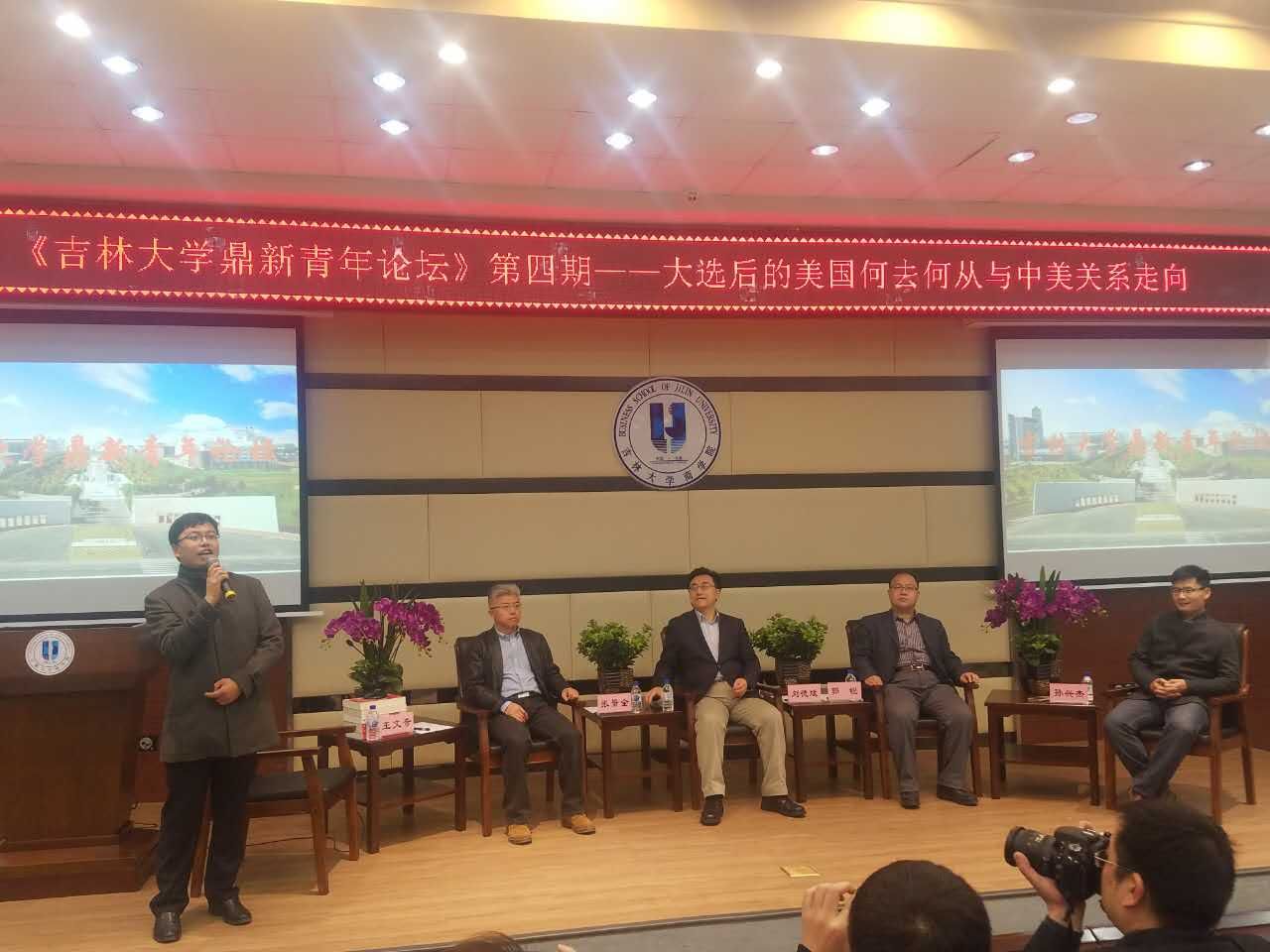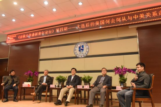 11月11日晚6:30,第四期英国威廉希尔唯一官网鼎新青年论坛在东荣大厦B310报告厅隆重举行。本次论坛由校团委青年文化书院联合公司团委共同举办。本次论坛的主题是:“大选后的美国将何去何从?中美关系的未来将如何走势?”论坛邀请了董事长助理兼william威廉亚洲官方经理、教授、博士生导师刘德斌,东北亚研究院国际政治所教授、博士生导师张景全,行政学院国际政治系教授、博士生导师郭锐以及william威廉亚洲官方副教授孙兴杰等作为主讲嘉宾。由william威廉亚洲官方副教授王文奇主持。