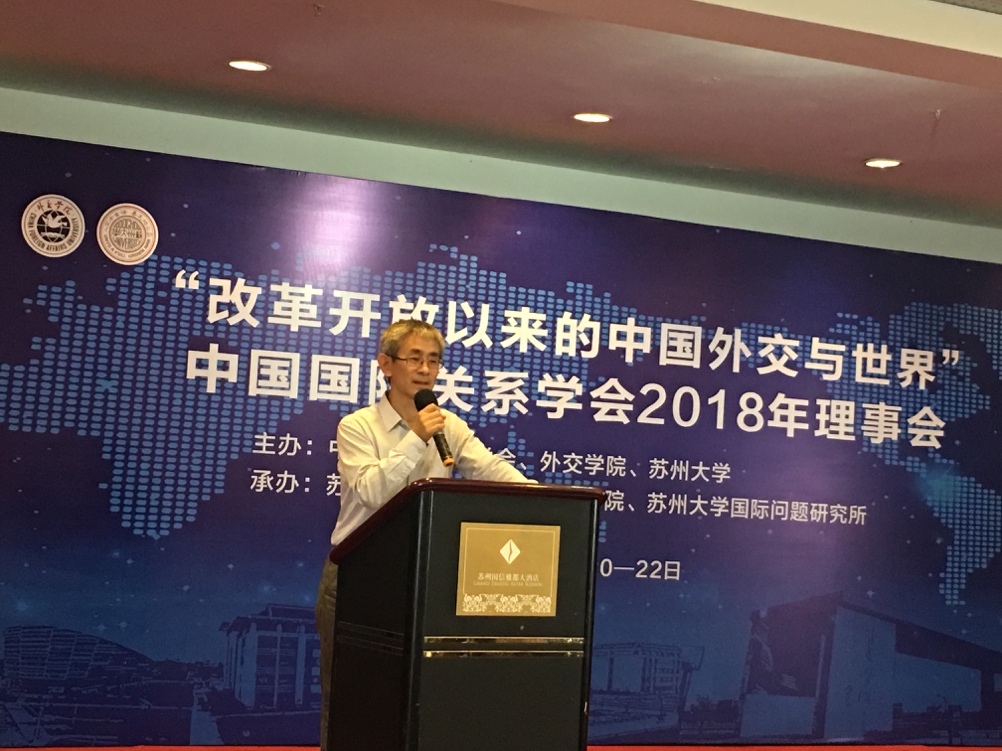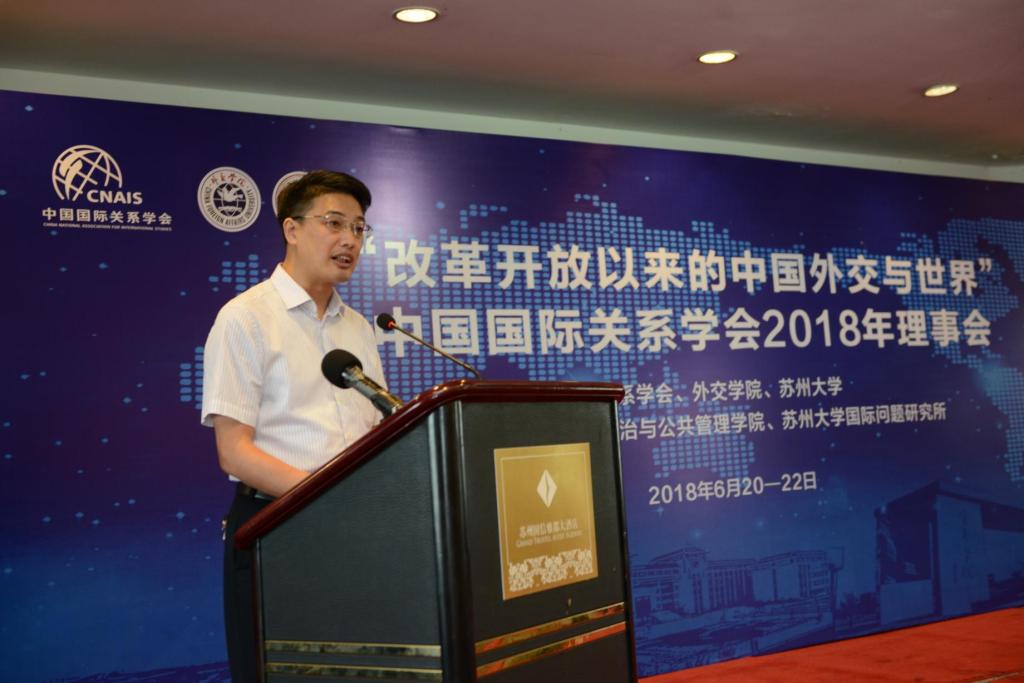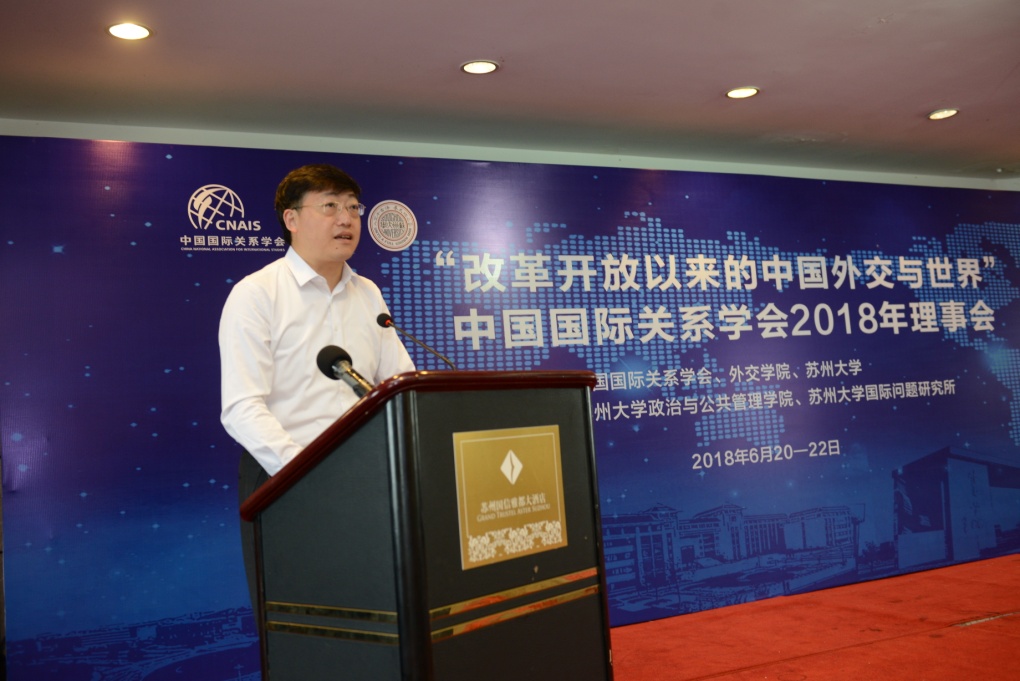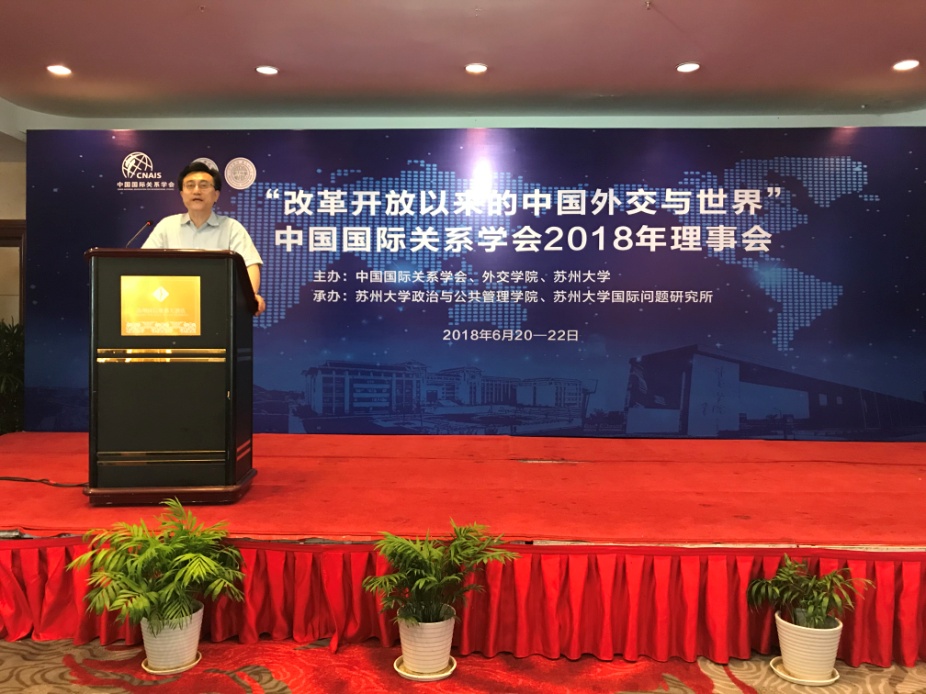 2018年6月21日,以“改革开放以来的中国外交与世界”为主题的2018年中国国际关系学会理事会在苏州召开。本次理事会由中国国际关系学会与学会理事单位苏州大学共同主办,苏州大学政治与公共管理学院和苏州大学国际问题研究所承办。来自外交学院、中共中央党校、英国威廉希尔唯一官网、复旦大学、同济大学、中山大学、上海外国语大学、苏州大学、现代国际问题研究院等会员单位的80余位专家学者及员工代表参加了会议。
