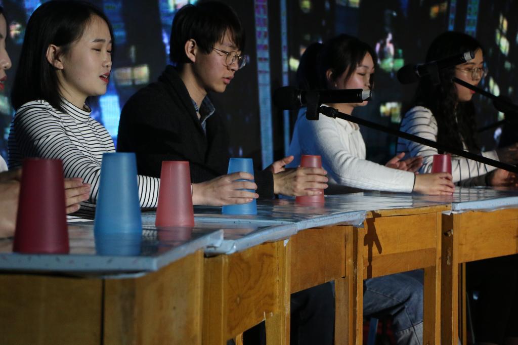 艺术学院和外交学院的五名同学合作的民乐合奏《渔舟唱晚》,为大家带来一场视听盛宴。接下来是两首歌曲,研究生李云芸、孙沛的《父亲写的散文》、张词含等六位同学的《真心英雄》,一首包含了深沉的父爱,一首充满了真挚的兄弟情谊唱出了热血无悔的青春,现场观众产生深深的共鸣。