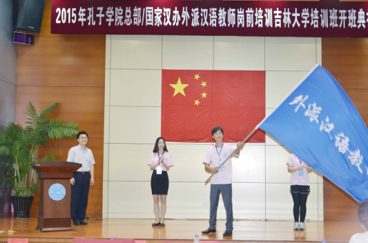 随后,培训学员代表从刘德斌教授手中接过印有“外派汉语教师”字样的旗帜。蓝色的旗帜在会场中舞动飘扬,场内响起热烈的掌声。