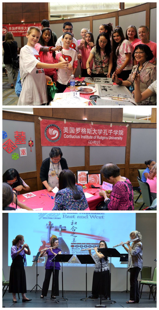 9月25日,美国新泽西州立罗格斯大学孔子学院在罗大布什校区(Busch Campus)的员工活动中心举办了庆祝“孔子学院日”大型系列文化活动。此次活动以“沟通与理解”为主题,以中国文化艺术节、“中国味道”美食节、以及“和合之美”中西交响音乐会三场大型活动来演绎中华文化中“和平”、“和美”的理念,庆祝抗日战争胜利70周年及中国传统节日中秋节的来临。活动现场人头攒动、热闹非凡,吸引了近千名新泽西中小员工、老员工及本地民众。新泽西当地主要华文媒体《世界日报》、《新象》等报社派记者进行了全程跟踪报道,罗格斯大学电视台也对整场活动进行了报道,此次活动得到了各方的好评。