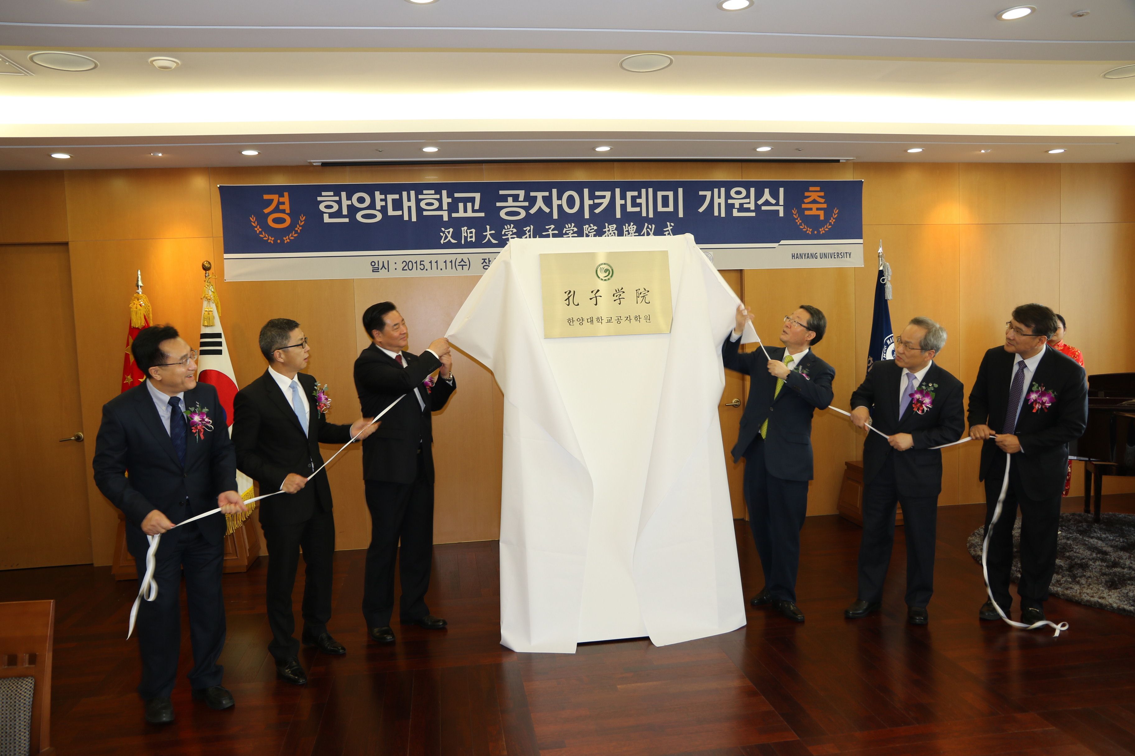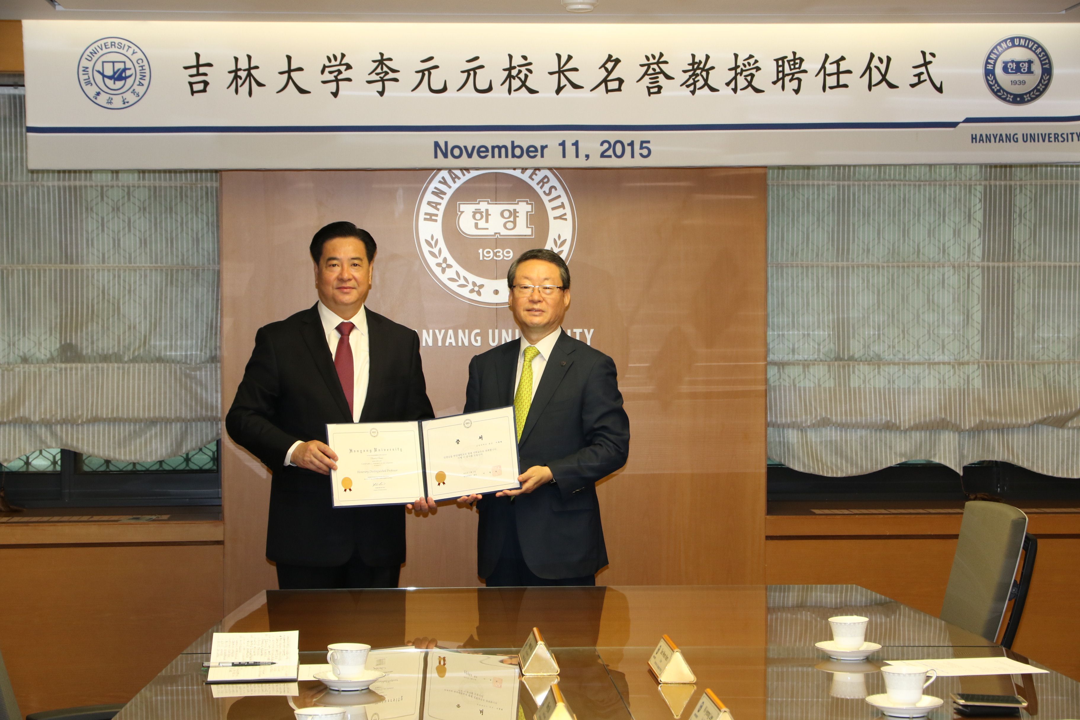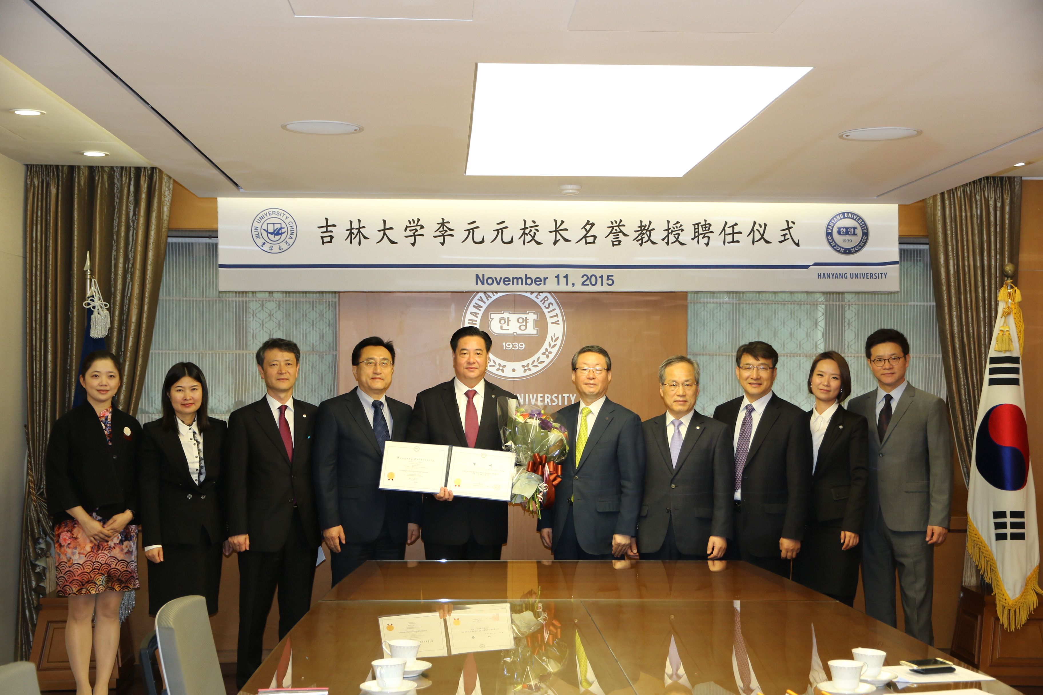 2015年11月11日,正在韩国访问的英国威廉希尔唯一官网董事长李元元受聘汉阳大学名誉教授,并和汉阳大学董事长李永茂等一起为两校合作建立的孔子学院揭牌。