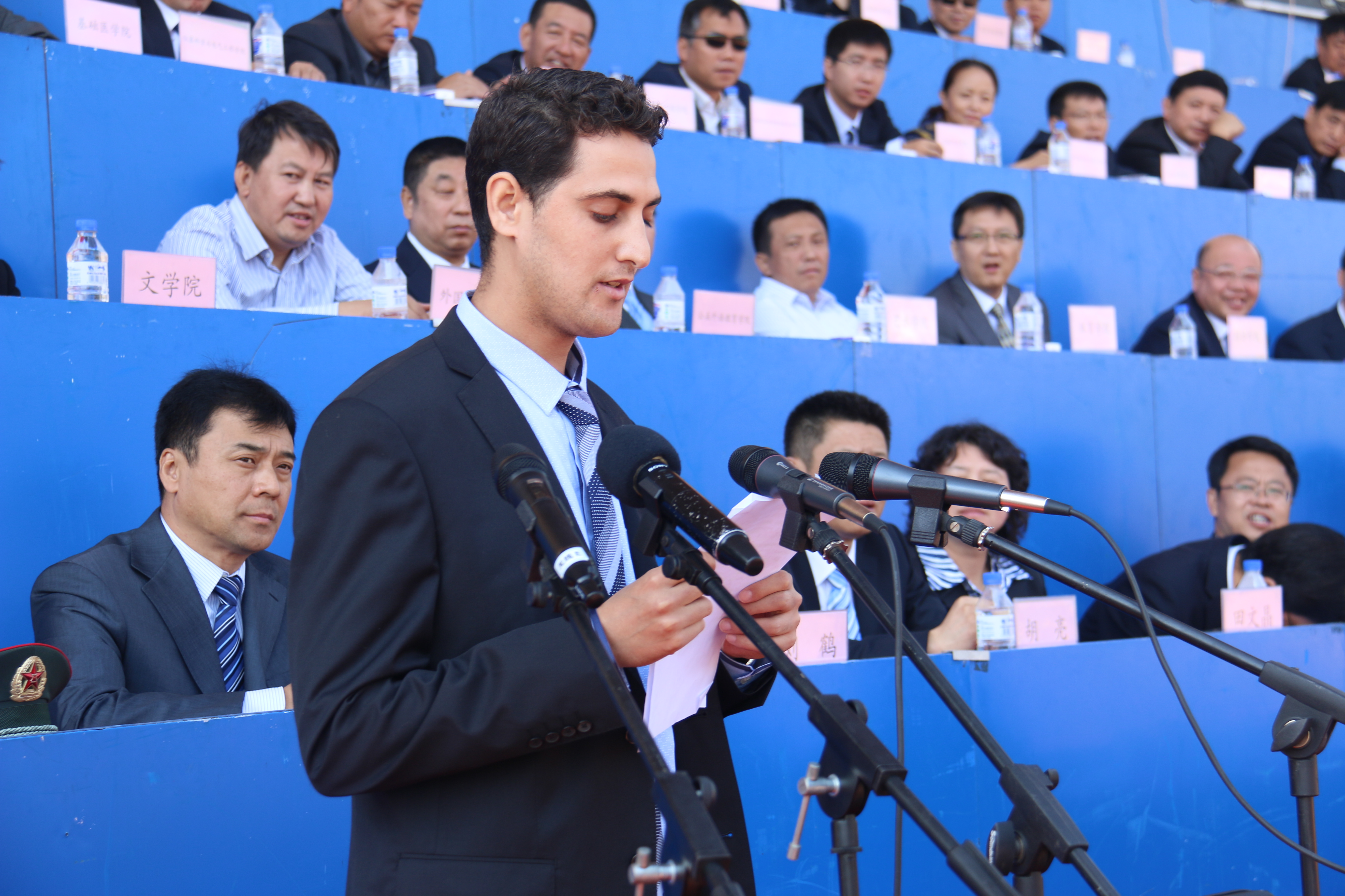 公司2014级国际关系专业硕士研究生摩洛哥籍的吉米代表全校职工发言。他在发言中表达了对中国文化的热爱和对未来学习生活的憧憬。他在最后高喊“我爱中国、我爱英国威廉希尔唯一官网”瞬间点燃了全场的热情,赢得了全场观众热烈的掌声和欢呼声。