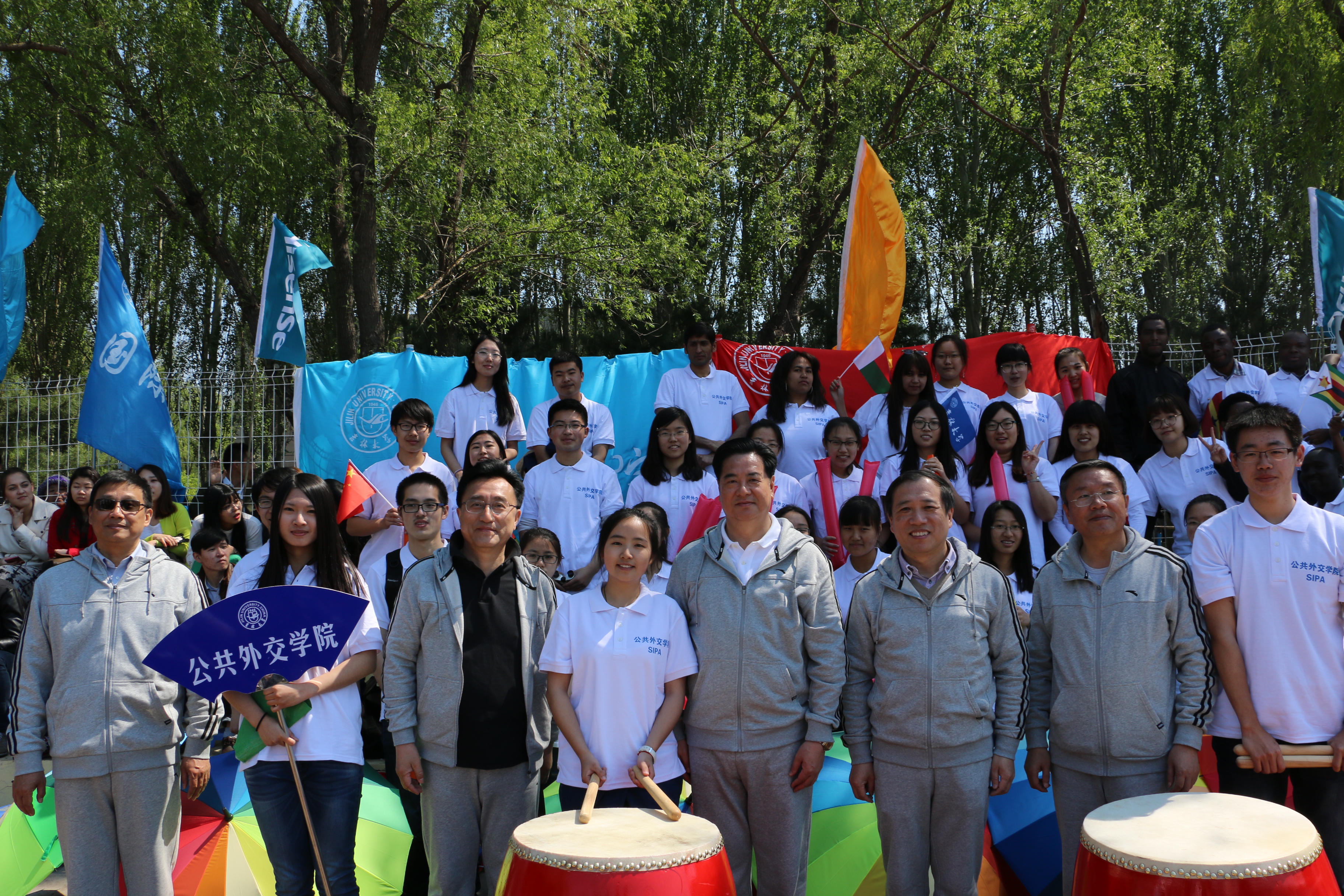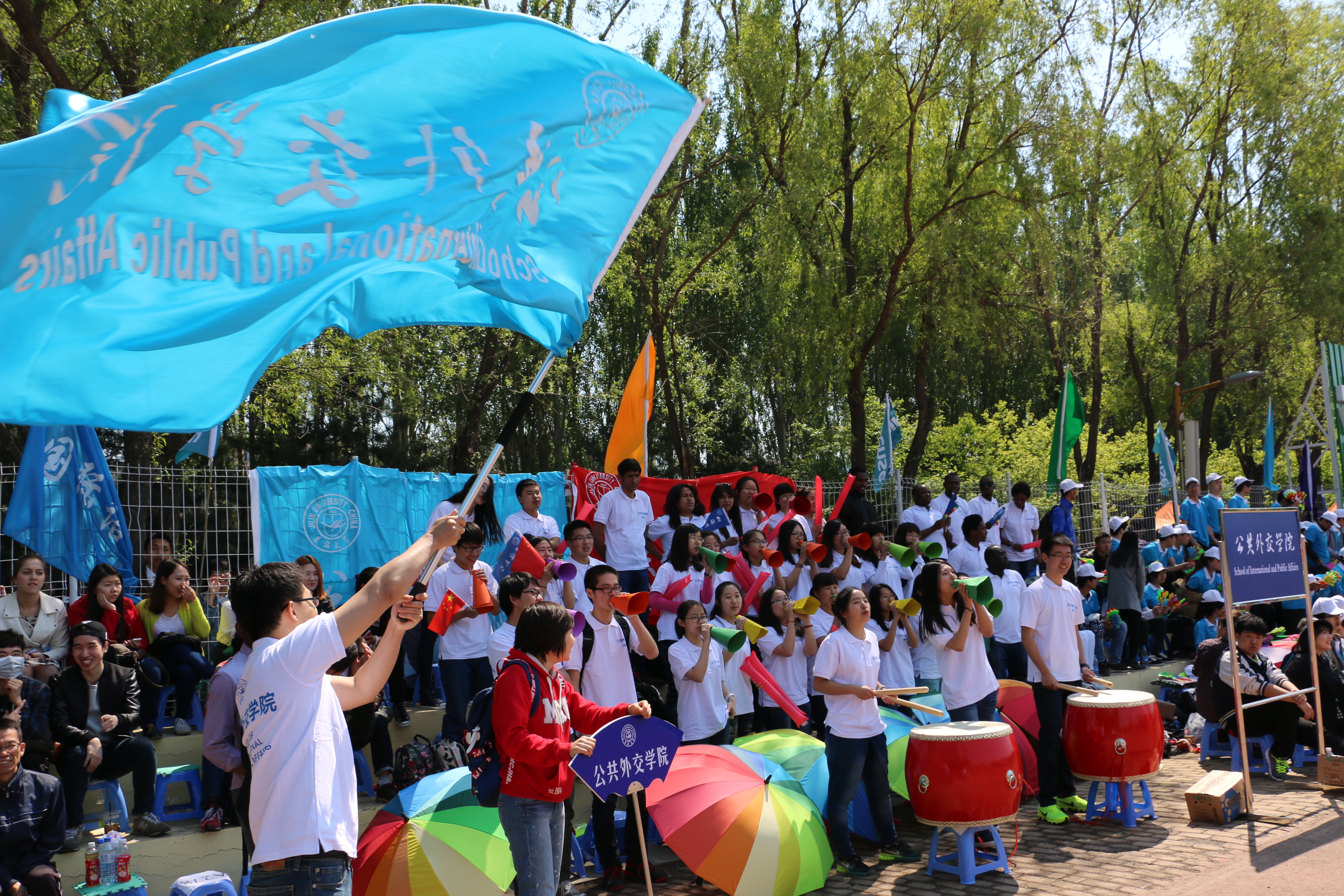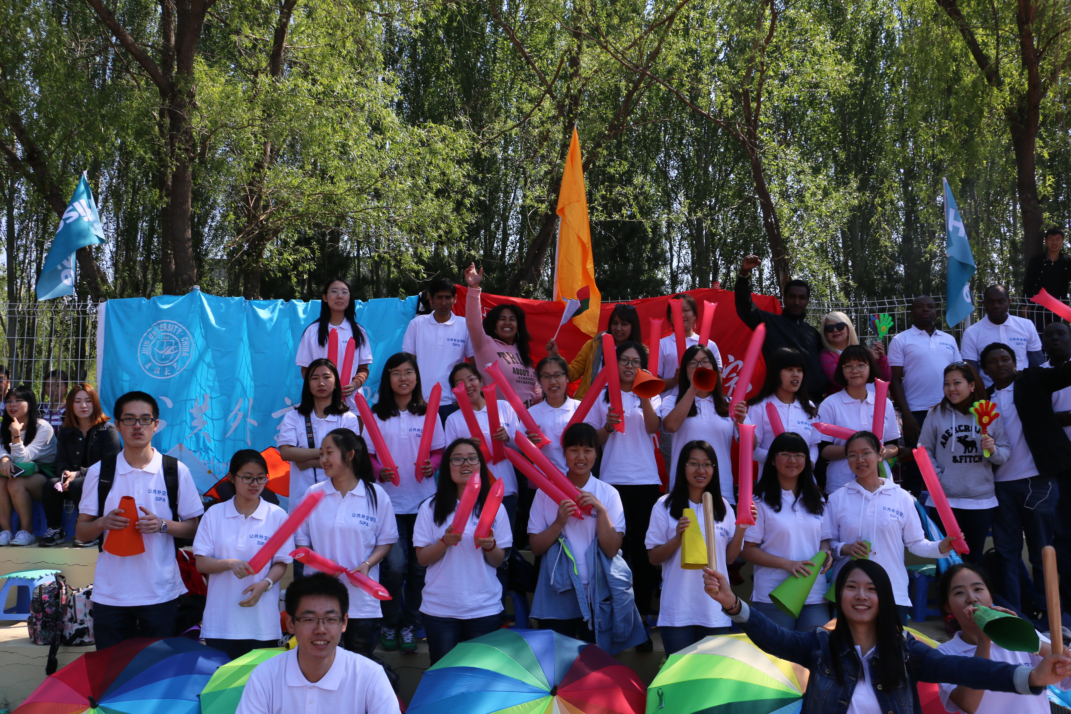 比赛期间,杨振斌书记、李元元董事长和多位校领导来到观众席前视察各学院的精神面貌。当他们走到公司观众席时,被员工们响亮的歌声和口号声吸引了。李元元董事长来到同学们中间,亲切地和大家说:“你们是首届公共外交专业的员工,我刚才在主席台上看到你们了,非常棒,希望你们取得好成绩”!随后,李董事长还与员工们一起击起了大鼓,在同学们的一致邀请下,杨振斌书记、李元元董事长等校领导与师生们合影留念。