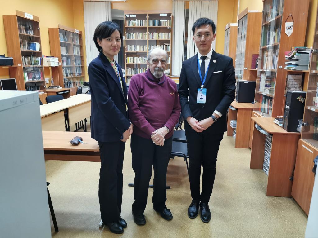 座谈结束后,调研团组同学分两组观摩梁赞国立大学孔子学院的课堂教学,分别是俄方扎普鲁德诺娃老师讲授的初级班汉语课程和中方志愿者教师魏榕辰讲授的高年级汉语实践课程。两位老师教学经验丰富、了解俄罗斯员工的特点、讲授内容生动形象,课堂气氛活跃。与此同时,乔蕊老师、刘治宸同学则在单妮娜经理陪同下拜访了梁赞国立大学德高望重的雅·玛·科尔格尔教授,他在梁赞国立大学孔子学院发展中发挥了重要的作用,双方进行了友好亲切的会谈。