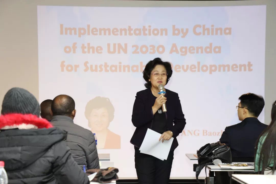 18日上午,前驻法国领事,加拿大国际发展署前资深项目官员杨宝珍女士,以“中国如何落实‘联合国2030可持续发展议程’”为主题,介绍了中国近年来在扶贫、教育、卫生、妇女地位、环保、和平正义,以及国际合作等方面取得的重大成果。杨宝珍女士指出,中国愿意与发展中国家分享经验,并为早日实现联合国可持续发展目标贡献力量。授课过程中,杨宝珍女士结合自身的经验,列举了大量生动的实践案例。课后,同学们踊跃提问,与杨女士进行深入交流。