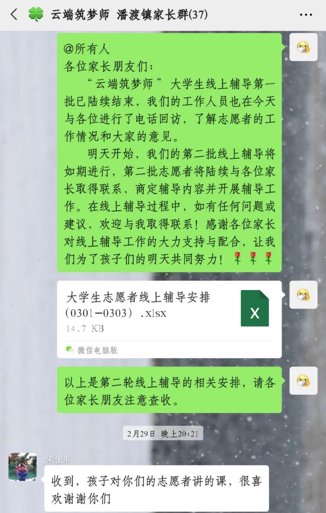 84名老员工志愿者中,有青年党员、有员工骨干,也不乏普通学子的身影。在这段特殊的日子里,他们通过腾讯会议、钉钉、微信语音等形式,为孩子们进行课业辅导,以实际行动诠释当代青年学子的家国情怀。