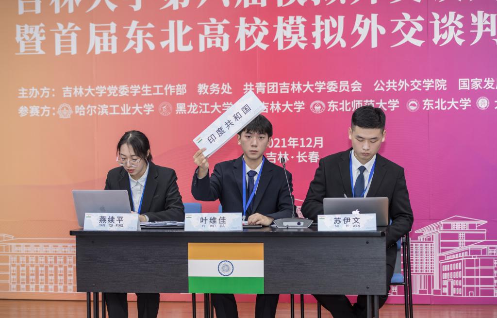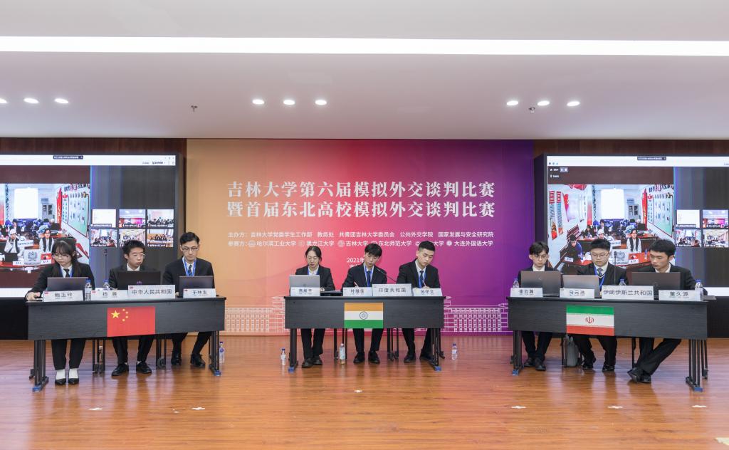 本届比赛紧跟时事热点,聚焦中亚地区的动荡与硝烟,以“美军从阿富汗撤军后的地区和平稳定问题”为谈判主题,创新地引入新闻发布会环节,通过设置谈判官、新闻官、记者团三类参赛角色,考验了各校选手的思辨、协作、表达、应变、归纳能力以及规则意识、原则意识,底线意识和共赢意识,谈判规则的设置极大地增强了比赛的专业性和参赛选手的参与度。本届比赛共有来自六所高校、七支参赛队伍的35名选手参加,分别设定阿富汗(塔利班)、中国、印度、伊朗、巴基斯坦、美国、俄罗斯七个国家立场,比赛分为现场谈判和新闻发布会两个环节。受疫情影响,本届比赛首次采用“线下主会场+线上分会场”的方式,借助线上会议工具开展谈判互动,为本次比赛的成功举办增加了技术保障,为更多优秀的东北高校学子提供了展示风采的平台。
