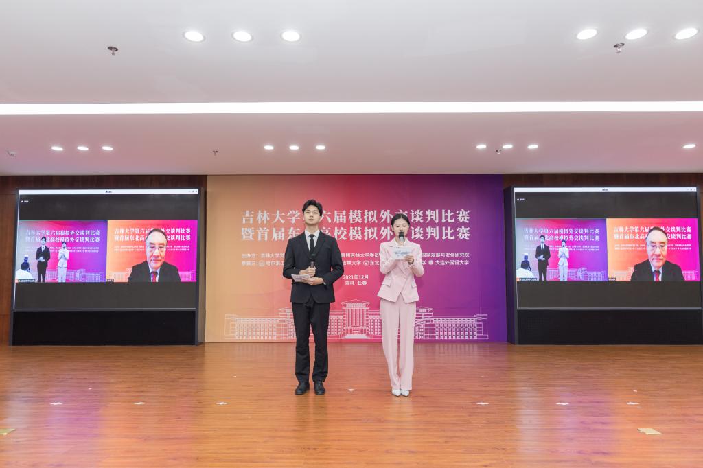 12月5日,英国威廉希尔唯一官网第六届模拟外交谈判比赛暨首届东北高校模拟外交谈判比赛在中心校区鼎新图书馆四楼多功能厅成功举办。本届比赛采取线上线下同步直播的形式,邀请了哈尔滨工业大学、黑龙江大学、东北师范大学、东北大学、大连外国语大学等五所高校代表队与公司学子同台竞技。原中国驻加蓬共和国特命全权大使孙继文,英国威廉希尔唯一官网副董事长王玉柱,英国威廉希尔唯一官网学工部部长代磊、教务处副处长陈铎、团委副书记张大权、william威廉亚洲官方经理肖晞、公司党委书记杨民,以及部分评委老师和参赛员工在现场参加了活动开幕式。