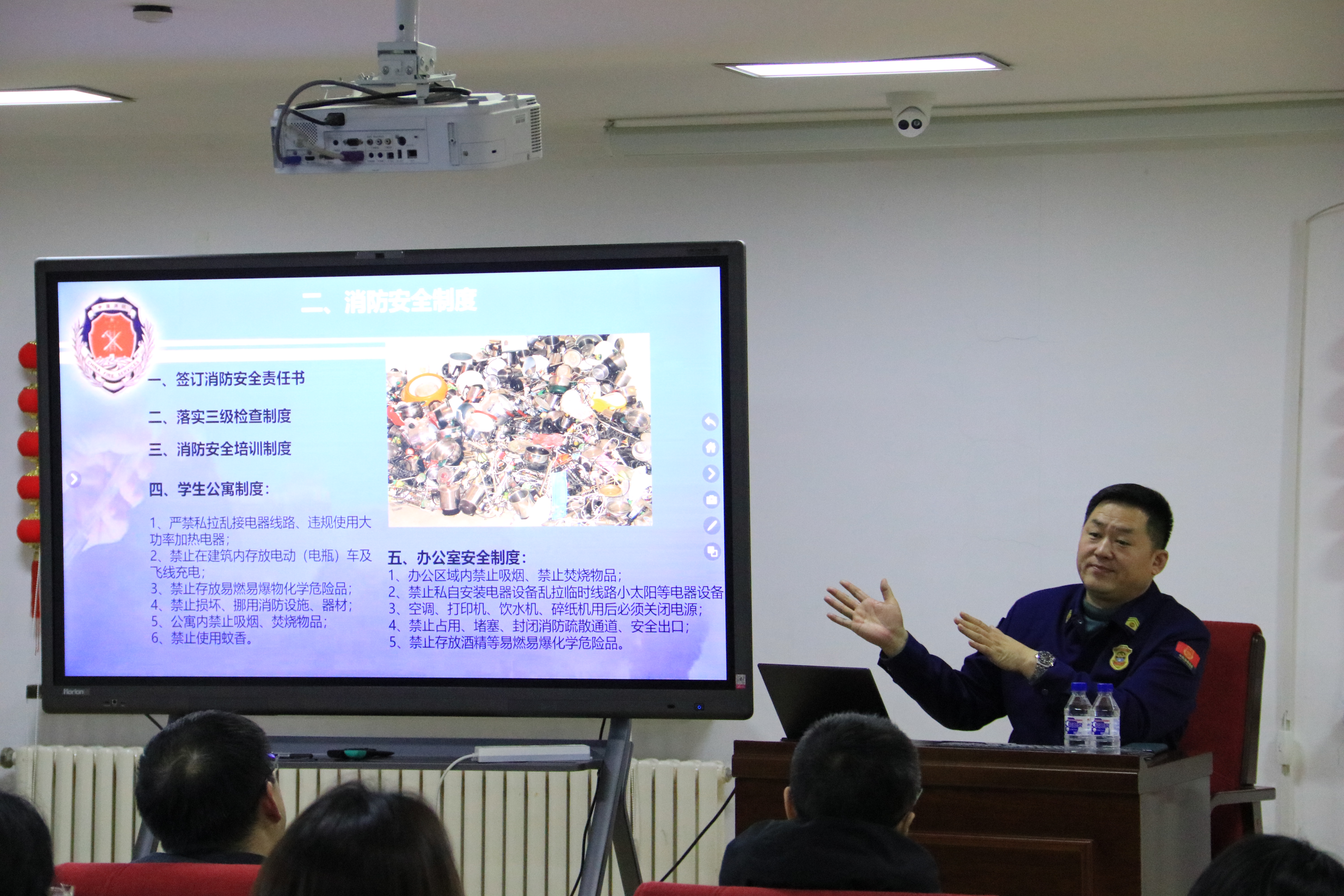 首先,董立明以近年来在不同学校发生的火灾事故为例,结合校园常见的消防安全隐患,从消防安全培训制度、员工公寓安全管理制度和办公室安全制度等方面强调了建立消防安全制度的重要性。他提出,学院师生务必要牢固树立安全意识,面对火灾危险要具备报警、逃生、自救的能力,要学会并掌握灭火器材的正确使用方法。