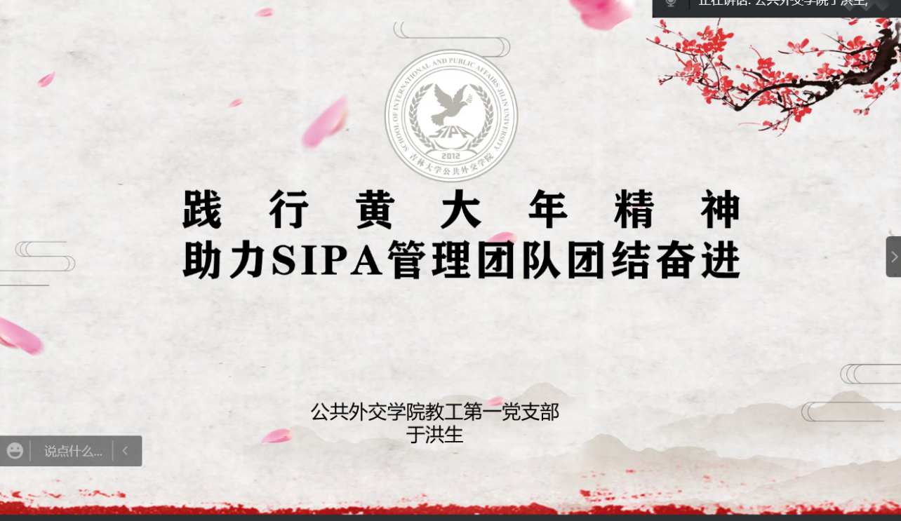 负责联系党支部的副经理于洪生以“践行黄大年精神,助力SIPA管理团队团结奋进”为题,为支部全体党员讲授了专题党课。他首先带领全体党员同志回顾了黄大年教授的生平,重温了习近平总书记对黄大年同志先进事迹作出的重要指示,理解“什么是黄大年精神”的同时,以“真切和真实,理解和践行,力行和传承,育人和感恩”为关键词,谈了自己对黄大年精神学习的心得体会。