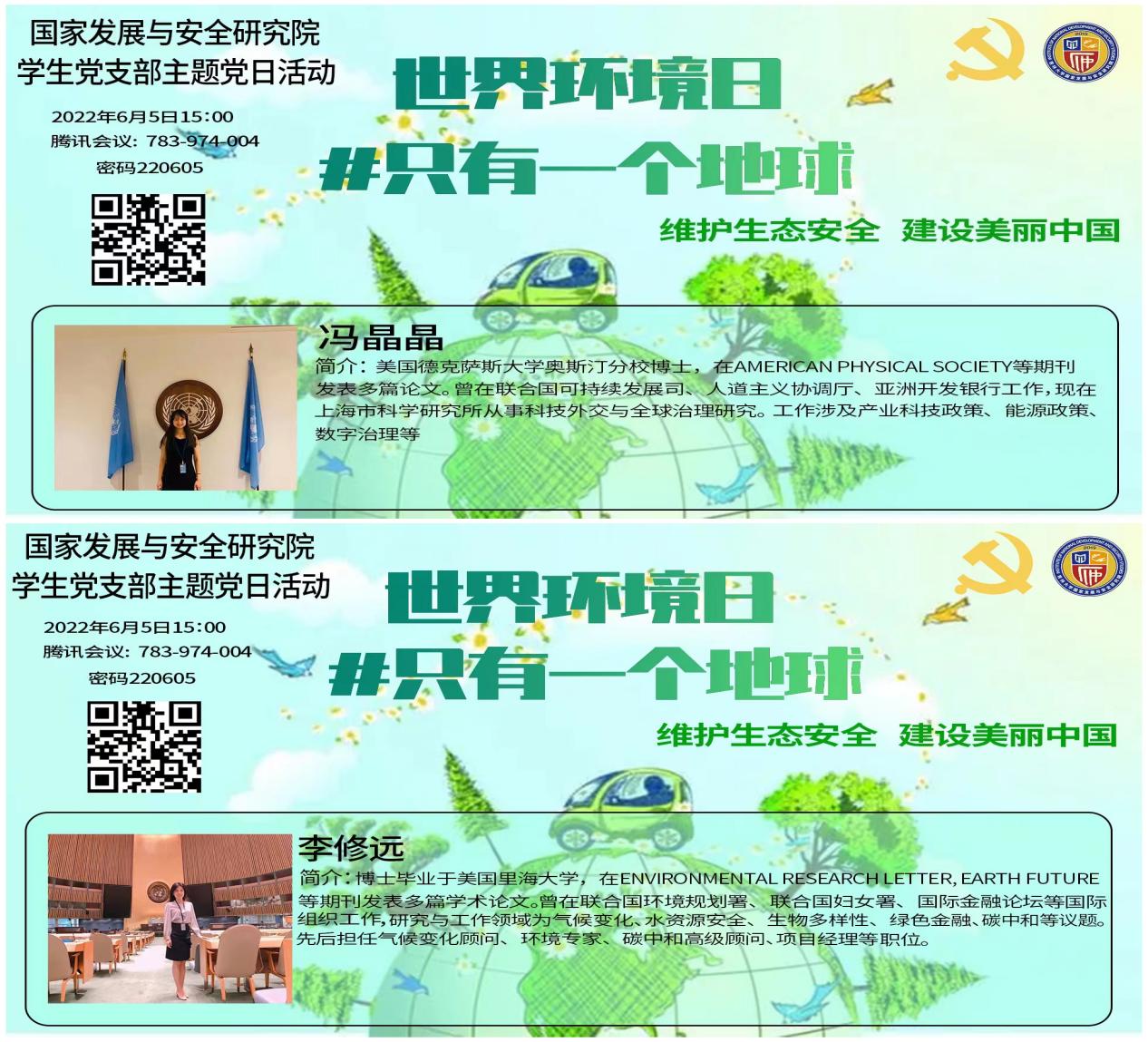 6月5日,国家发展与安全研究院员工党支部以“维护生态安全,建设美丽中国”为题召开线上主题党日活动。此次活动特别邀请原国际金融论坛环境专家、联合国环境规划署、妇女署顾问李修远博士和上海市科学学研究所研究员、原联合国可持续发展司职员冯晶晶博士后参会分享,william威廉亚洲官方经理、国家发展与安全研究院经理肖晞教授、公司党建工作办公室主任张仁萍老师参加活动并予以指导。党支部全体党员和入党积极分子参加了此次活动。活动由党支部书记杨依众同志主持。