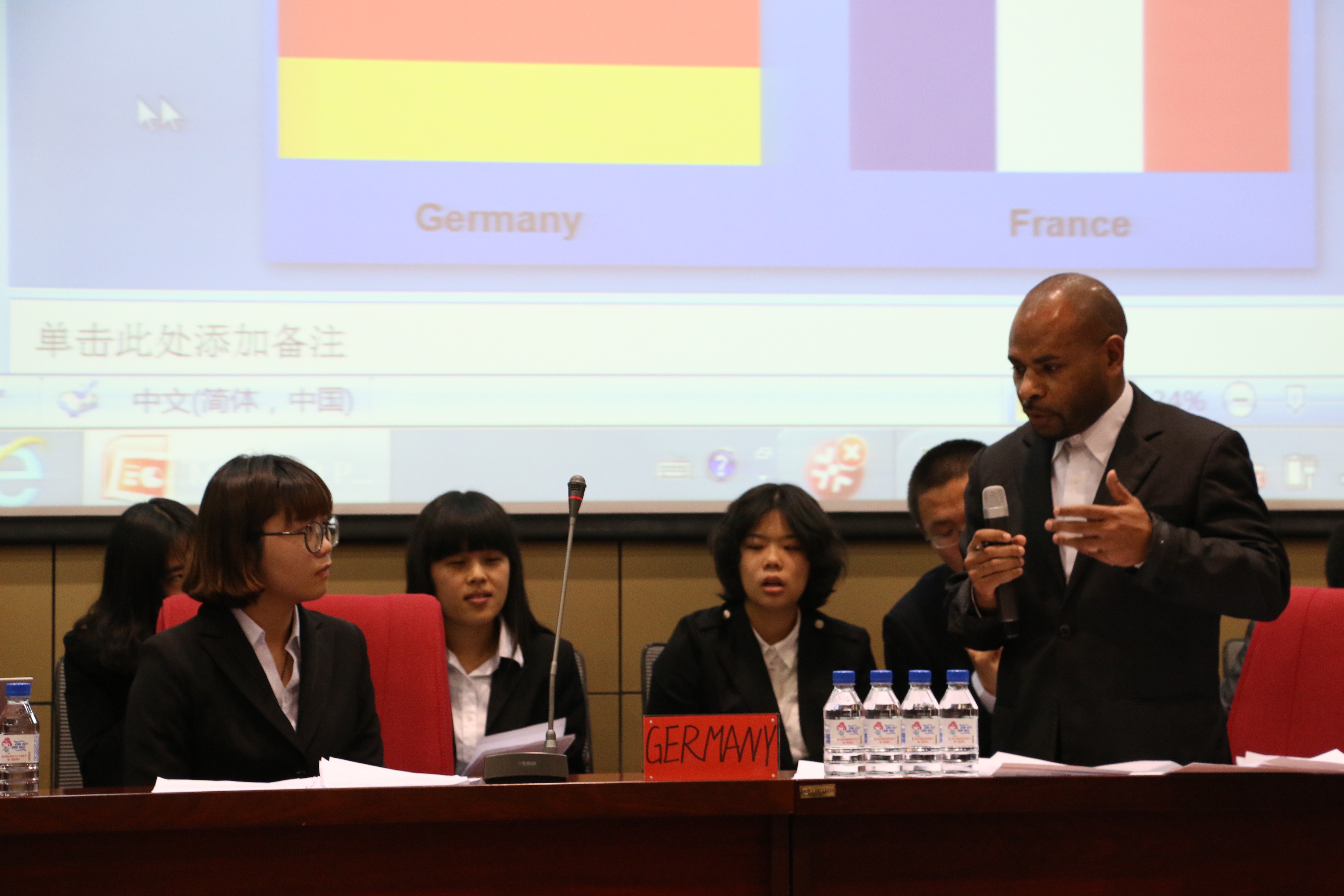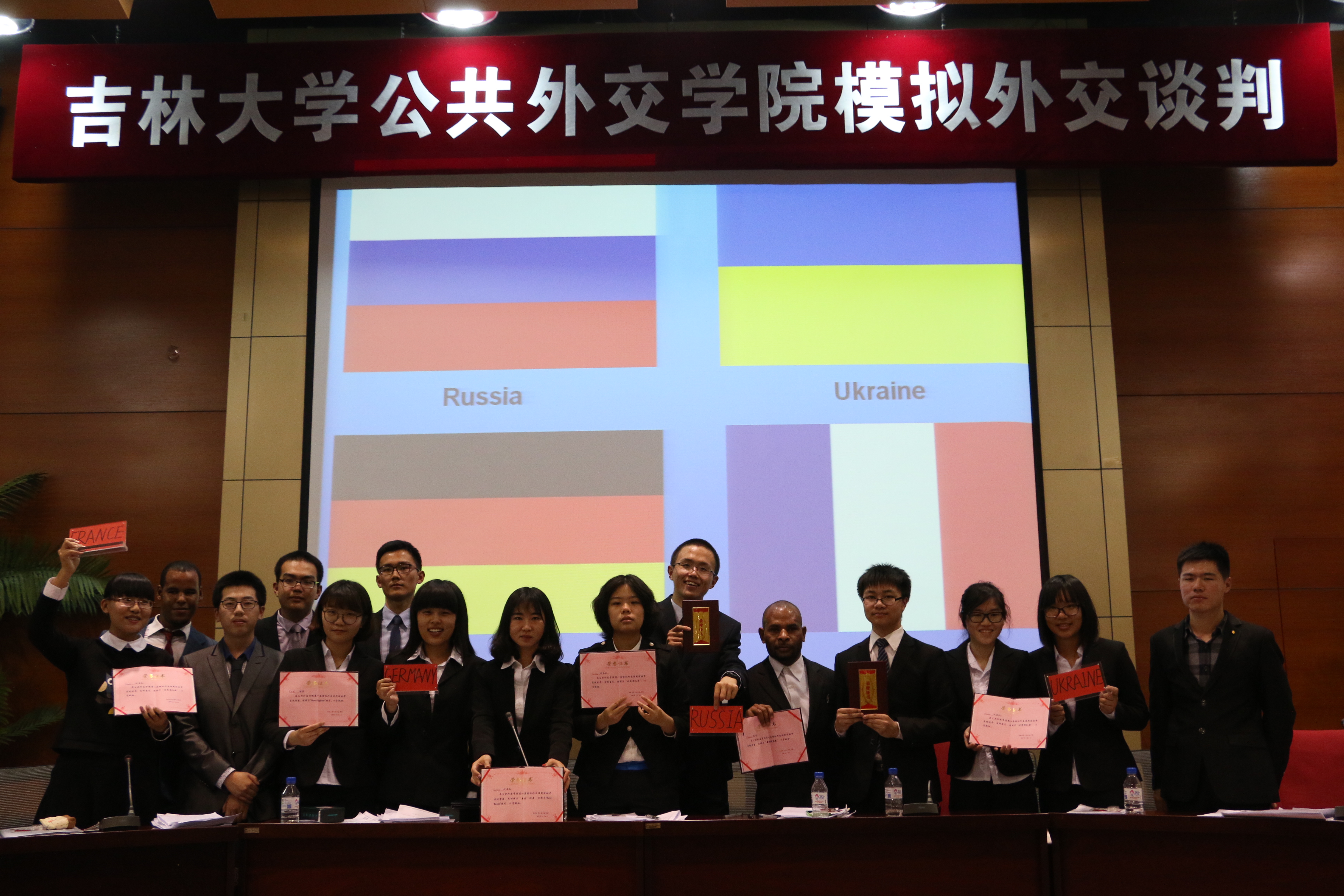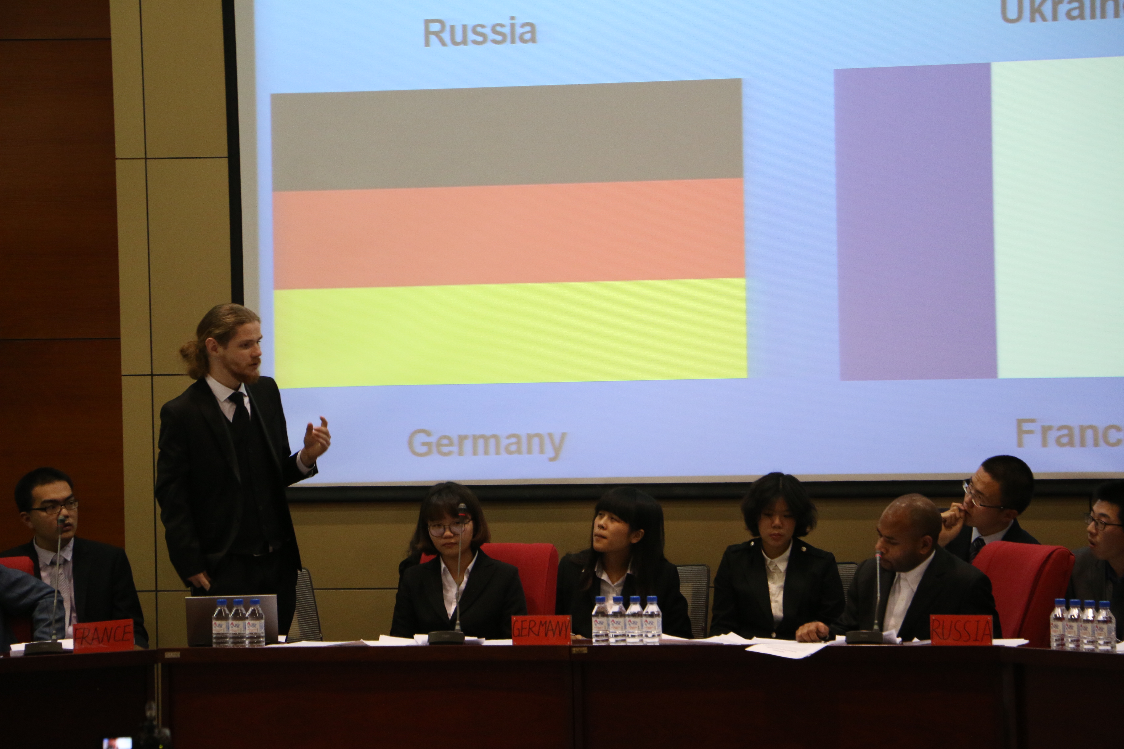 本期外交谈判就乌克兰危机这一主题展开,公司本科学、职工以及来自其他学院的同学16名同学组成了法国、德国、俄罗斯和乌克兰四国外交代表团,就既定目 标进行斡旋、争论、磋商,最终达成协议共识。谈判流程分为五个部分,分别为文件公示、立场阐述、各国质询、公开演讲以及经自由谈判后达成最终协议。本次活 动全程用英文进行,同学们在争论质询和自由谈判中挥洒激情,大大提高了外交英语的实际运用能力。