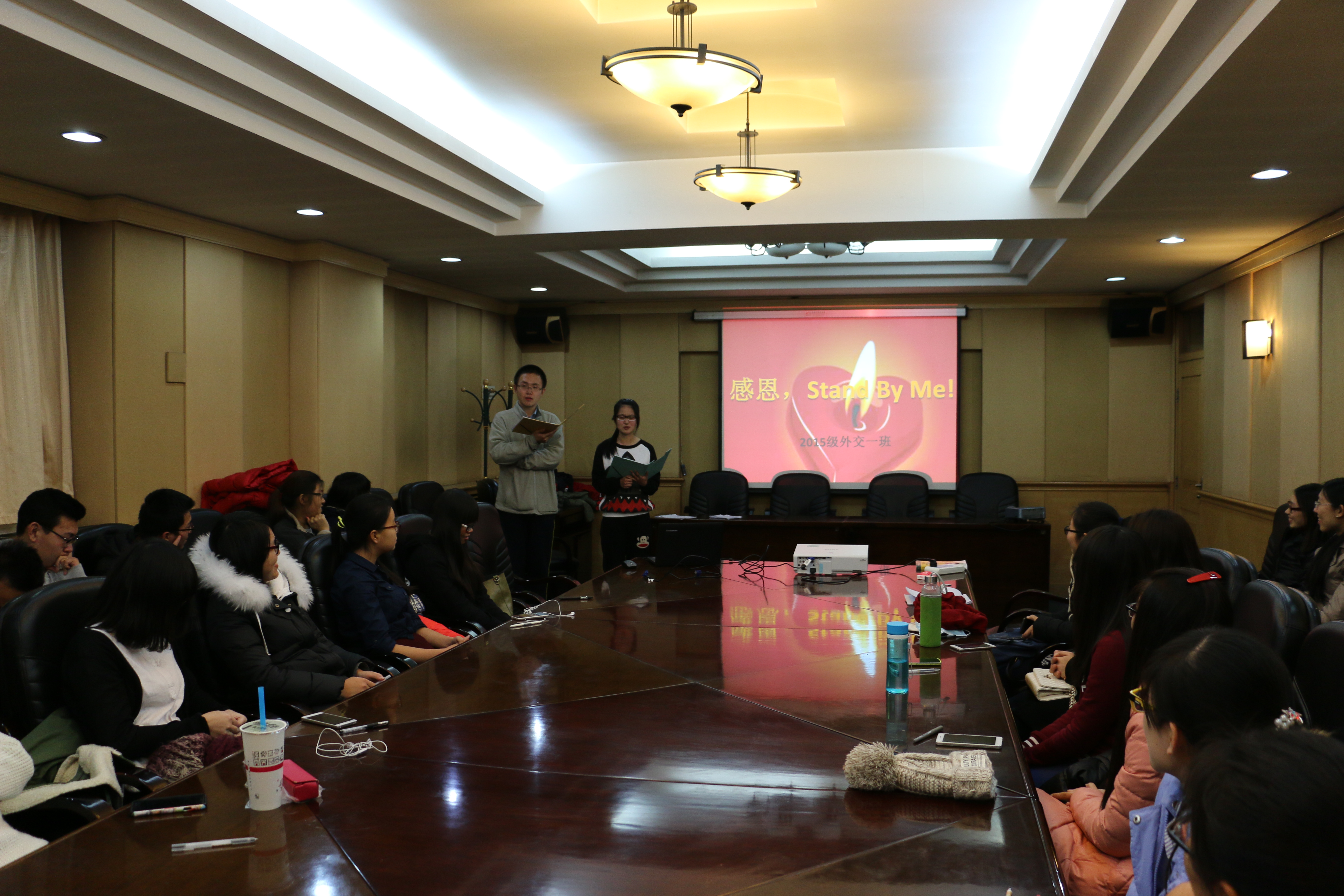 11月27日下午4时,william威廉亚洲官方外交学2015级“感恩,伴我同行”主题班会在友谊会馆大会议室如期举行。本次活动呼应感恩节的节日氛围,旨在提升同学们对于中华优秀传统美德——感恩的认识与理解。并借此机会进一步加强师生间的沟通及班级内部的凝聚力。