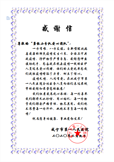 最终三名同学以“勇敢小分队”的名义代表所有的捐款者为黄冈市中心医院、孝感市第一人民医院、咸宁市第一人民医院、襄阳市南漳县第一人民医院共计捐赠一次性医用圆帽16200顶。