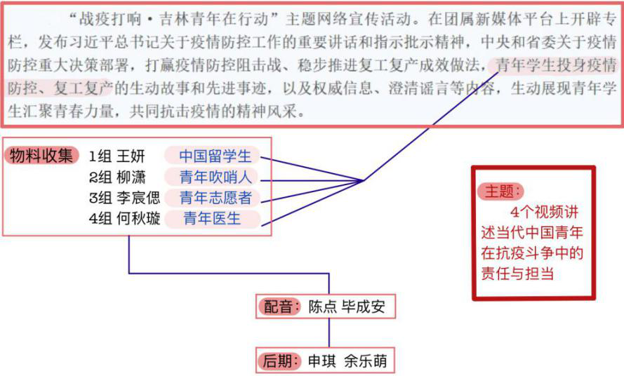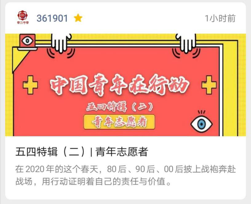 本次活动,以青年吹哨人、青年志愿者、中国青年职工、青年医者四个视角为切入点,分别制作短视频,讲述当代中国青年在抗疫斗争中的责任和担当。
