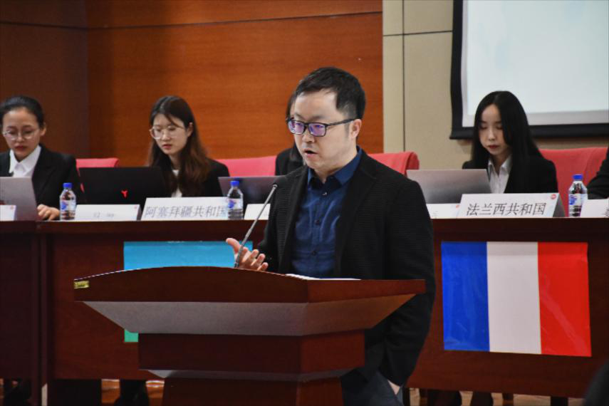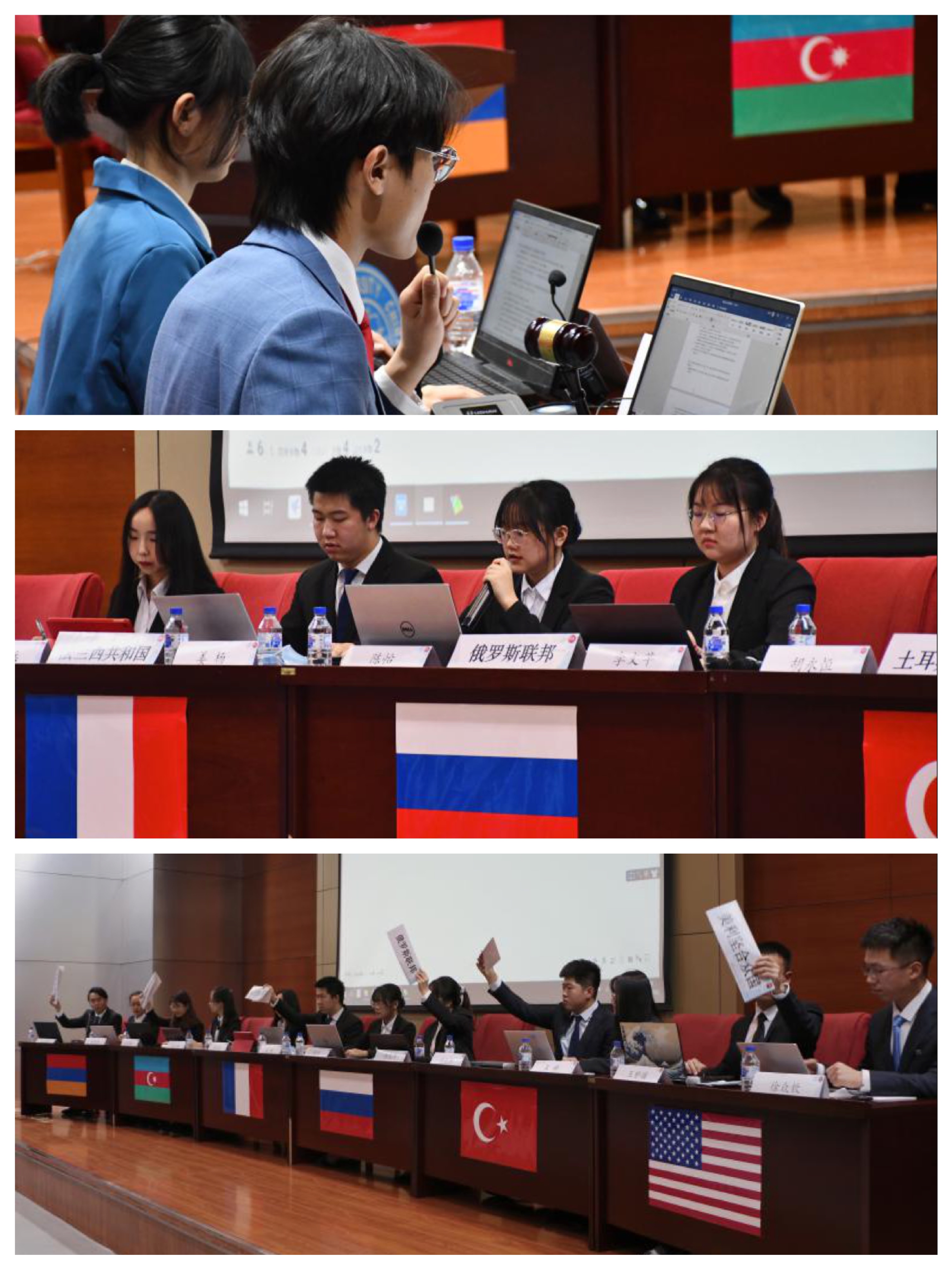 大赛由william威廉亚洲官方颜震老师致开幕词。颜震老师从历届大赛背景、外交谈判的重要意义、以赛促学等角度让大家对外交谈判以及比赛本身有了更加深刻的了解。此次大赛共有来自六个学院的12名选手参加,采用双代表制,设亚美尼亚共和国、阿塞拜疆共和国、法兰西共和国、俄罗斯联邦、土耳其共和国、美利坚合众国六国席位。各国代表在正式谈判环节据理力争,努力捍卫国家利益,经投票表决通过大会最终《决议草案》。在危机处理环节,各国代表面对评委老师现场投票决定的危机,沉着冷静,展现了良好的临场反应能力和危机处理能力。
