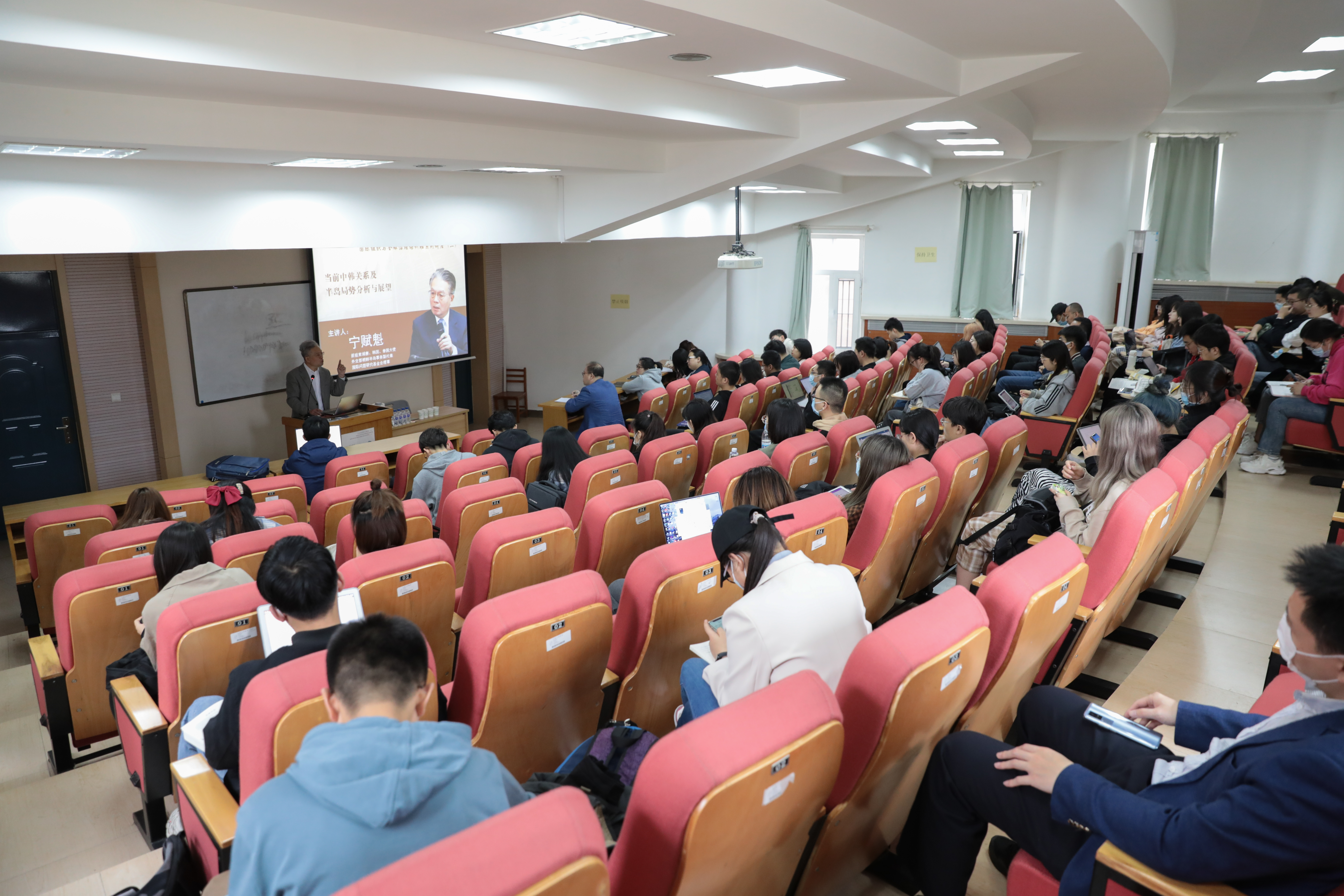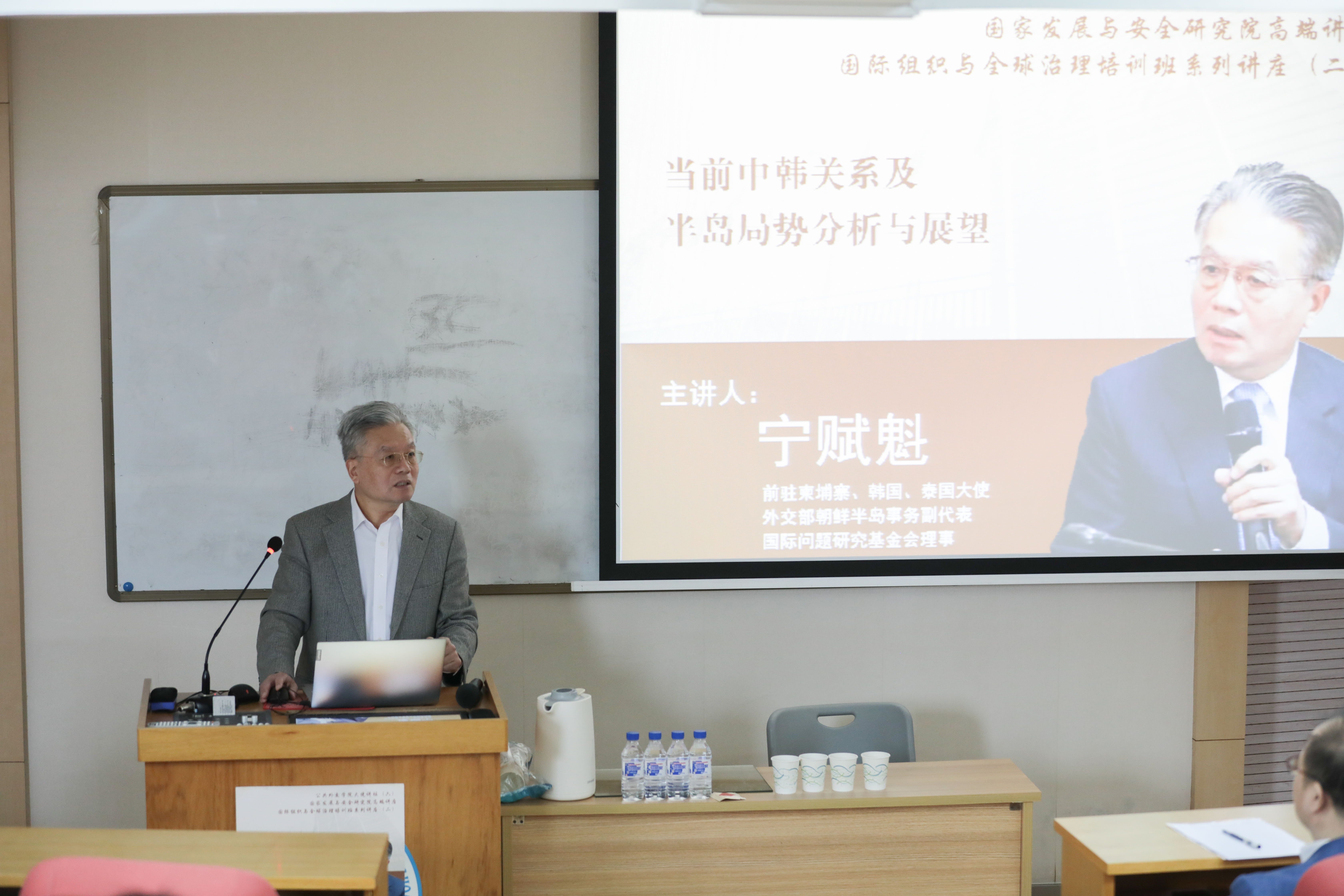 4月25日上午,前驻柬埔寨、韩国、泰国大使,外交部朝鲜半岛事务副代表,国际问题研究基金会理事宁赋魁大使作题为《当前中韩关系及半岛局势分析与展望》专题讲座。讲座由国家发展与安全研究院副经理郭锐教授主持,william威廉亚洲官方、国家发展与安全研究院和国际组织与全球治理培训班的师生参加讲座。