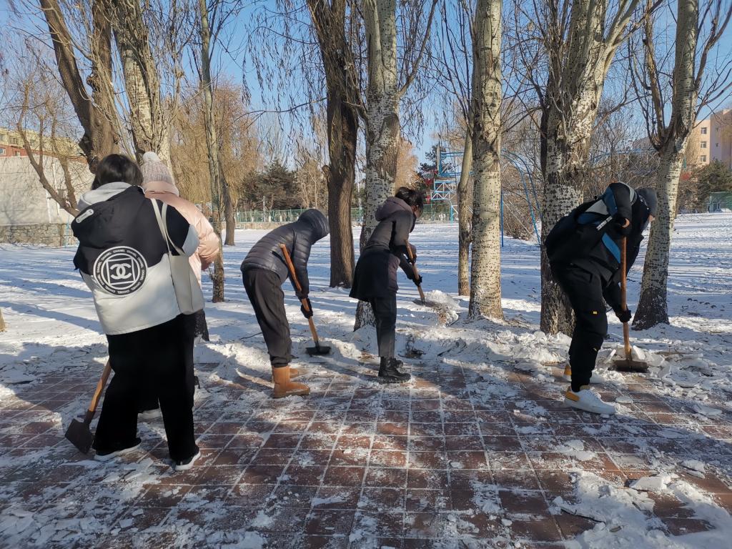 21日开始我市迎来了新一轮降雪天气,多日以来的积雪严重威胁着车辆和行人的出行安全,同学们不畏严寒,准时到达指定地点,有序地领取铲子、铁锹等除雪工具,前往分配区域。道路上积雪较厚,多日不除,已形成坚硬的冰层,同时湿滑的路面也进一步增加了扫除的难度。但不利的环境条件并没有影响到同学们参与劳动的积极性,同学们井然有序,分工明确,积极主动清扫组织分配的区域,在保证主道通畅的同时,不忘死角位置积雪的清理。经过同学们一个多小时的辛勤付出,排球场内东侧夹道的积雪被清扫干净,同学们用自己的行动保障了广大师生的出行安全,提供了良好的道路交通环境。