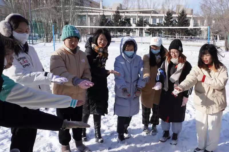 活动开始,班长和团支书给大家分完组后就开始了活动的第一项——活波欢闹的雪仗。北方的雪蓬松而散,很难聚合,同学们用手套压一压雪、趁其他同学没有防备的时候一把呼到眼前,发光的粉末就在阳光下淋了同学老师们一脑袋,似乎一转头就是好大一个“惊喜”。同学们和老师之间没有严肃沉闷的气氛,而在追逐打闹里笑成一团,松软的雪球碰撞出了轻松和愉悦。