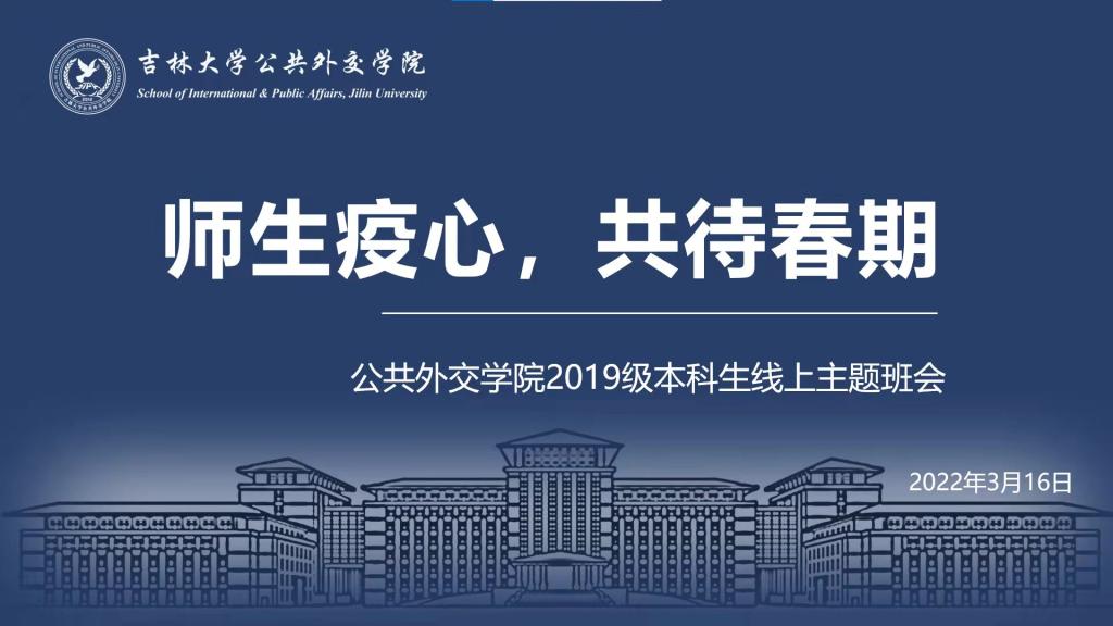 此次班会以“愿春来‘疫’去,山河无恙”结尾。通过本次主题班会的线上交流,老师们从疫情防控、日常生活、专业学习、心理健康、就业规划等多个方面传递了对全体外交学子的关怀;同学们在交流分享中既深刻地认识到增强防疫意识、遵守防疫要求和做好个人防护的重要性,也更加明确了防疫不妨学,接下来仍要以饱满的热情投入到线上学习中,做好生涯规划,同时不断调适心情,积极锻炼,全力支持学校疫情防控工作,共筑校园防疫壁垒。相信在全体师生教职员工的共同努力下,我们定能战胜疫情,迎接春暖花开!