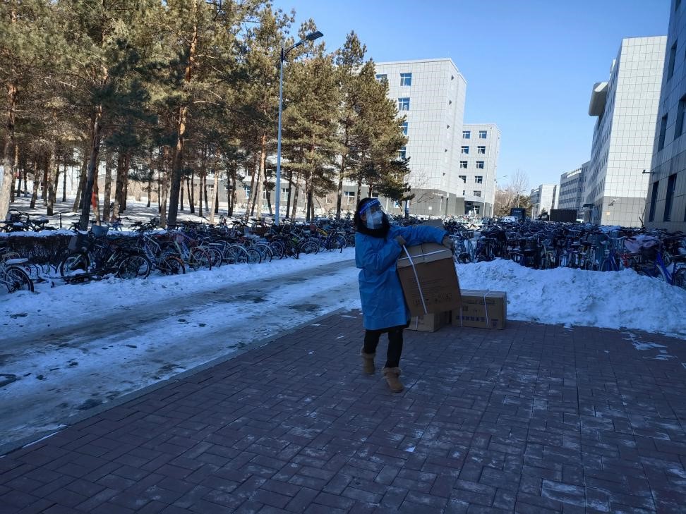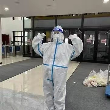 于晴老师负责北苑三公寓3700名员工的早中晚三餐、防疫物资、水、试剂盒以及员工购买的生活用品的发放;同时也负责全楼核酸试剂盒检测结果的统计以及巡楼工作。除此之外,于晴老师也会随时和各位同学与学院负责人沟通沟通,确保大家身心健康,保证事情能够及时传达给各位同学。