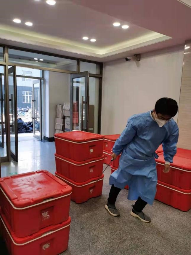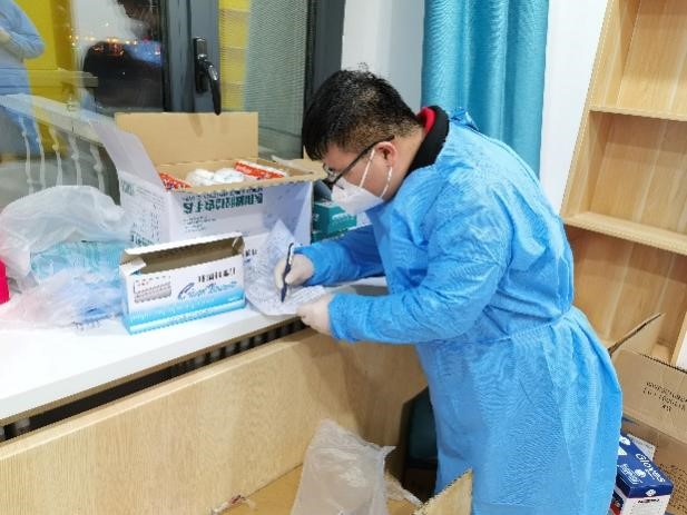 樊鸿刚老师负责管理北苑四公寓西区约2500名研究生。每日负责组织三餐和饮用水发放,防疫物资和生活物资的接收和发放,给同学们送药,组织各学院、各楼层的志愿者、党员员工开展志愿服务工作,统计和上报各类信息,处理楼内突发事件等等。