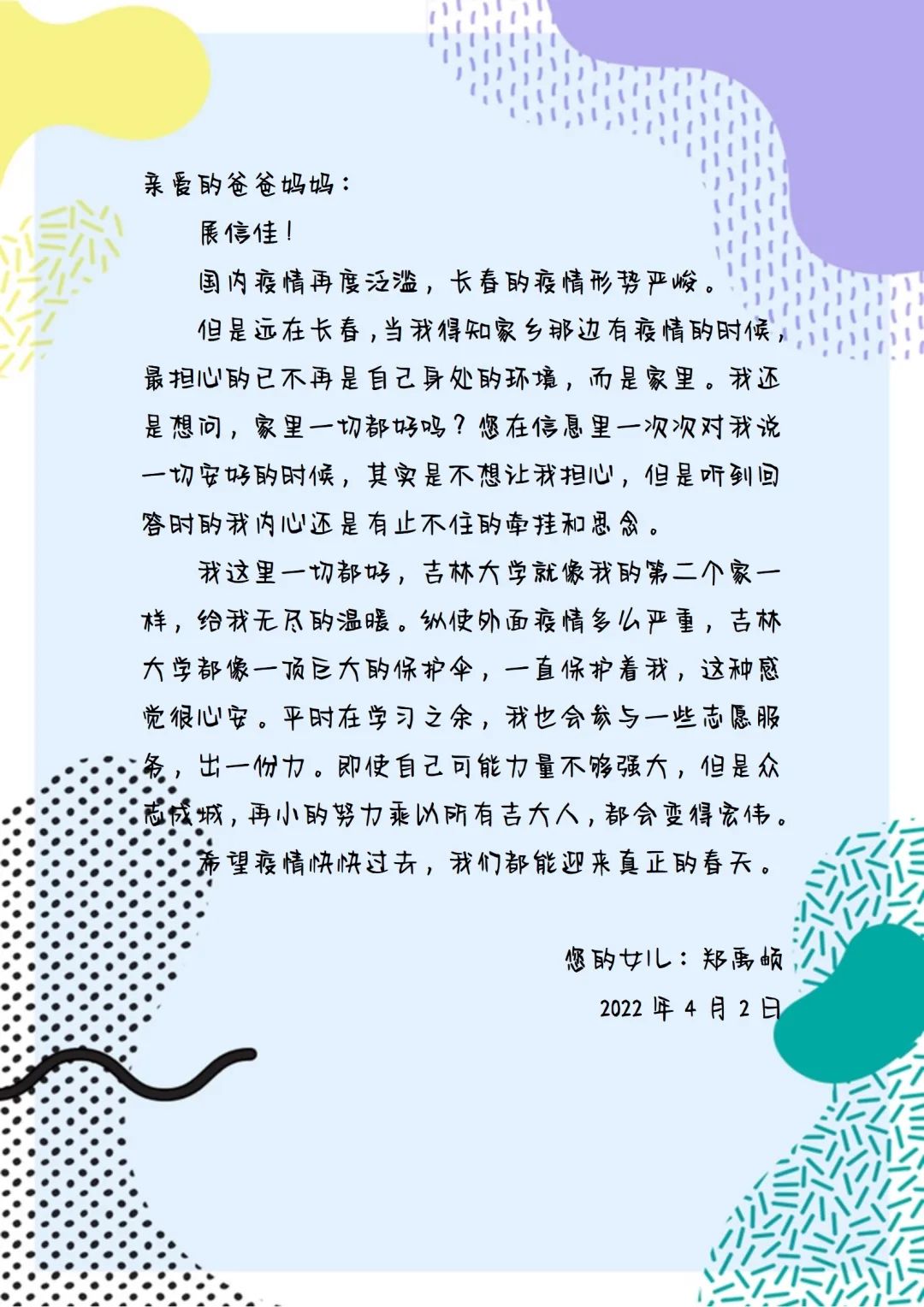 驿寄梅花,鱼传尺素,家书承载着我们对远方亲人的思念,维系着人间真情。为了弘扬传统美德,增强家校情感互动,坚定疫情防控决心,公司举办了一封“家书”征集活动,鼓励外交学子们给家人写一封家书,介绍封校期间的学习生活情况,传达自己的封寝感受,分享自己的抗疫志愿活动经历。