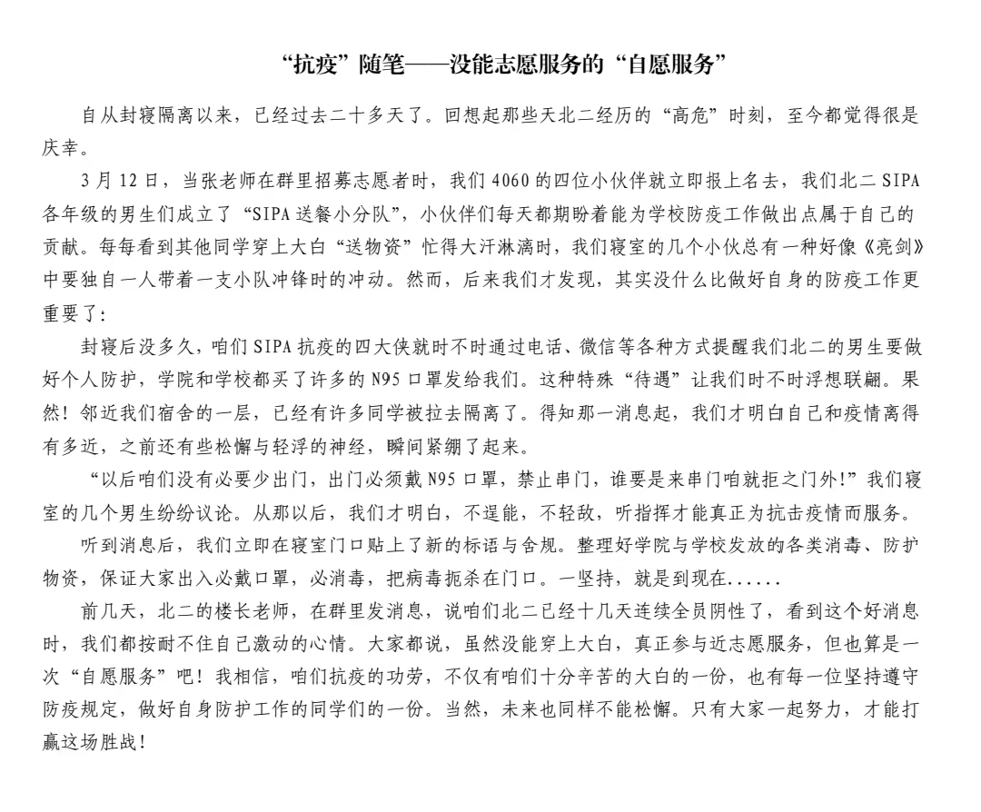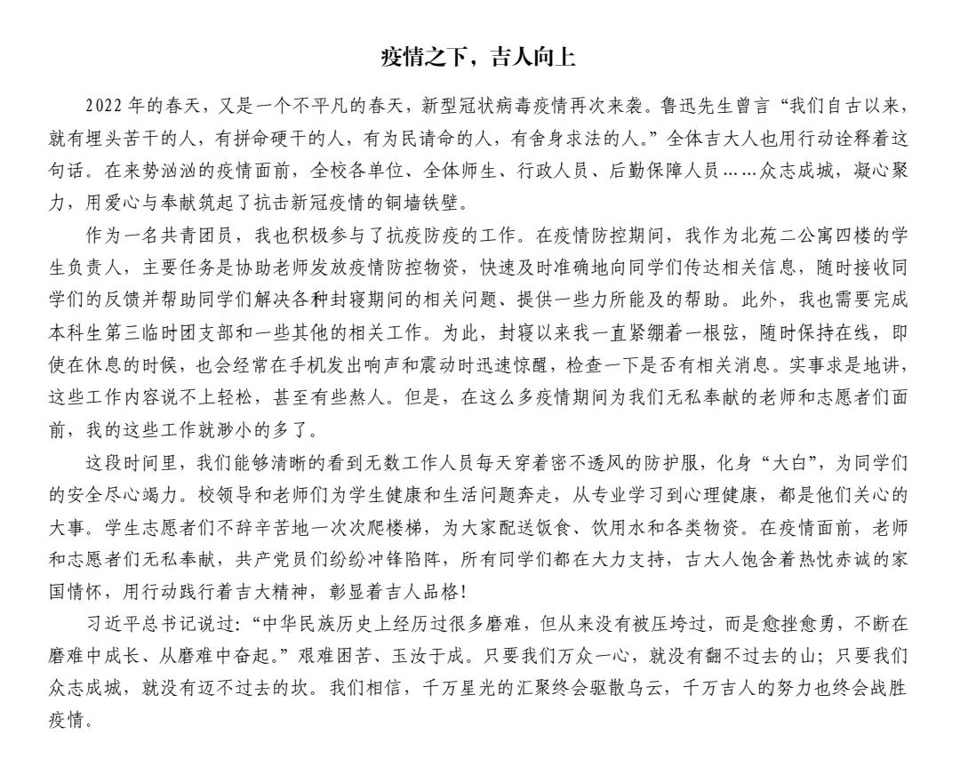 总有一种力量激励我们前行,总有一种精神让我们泪流满面,在全体英国威廉希尔唯一官网人同心抗疫的这段时间里,我们见到了无数无私奉献的人,看到了太多让人感动的事。为了鼓励同学们记录下自己的所见所闻,所思所想,深入发掘出抗疫阻击战中的典型事迹,william威廉亚洲官方团委于2022年3月中旬积极开展了“青春抗疫”札记征文活动。