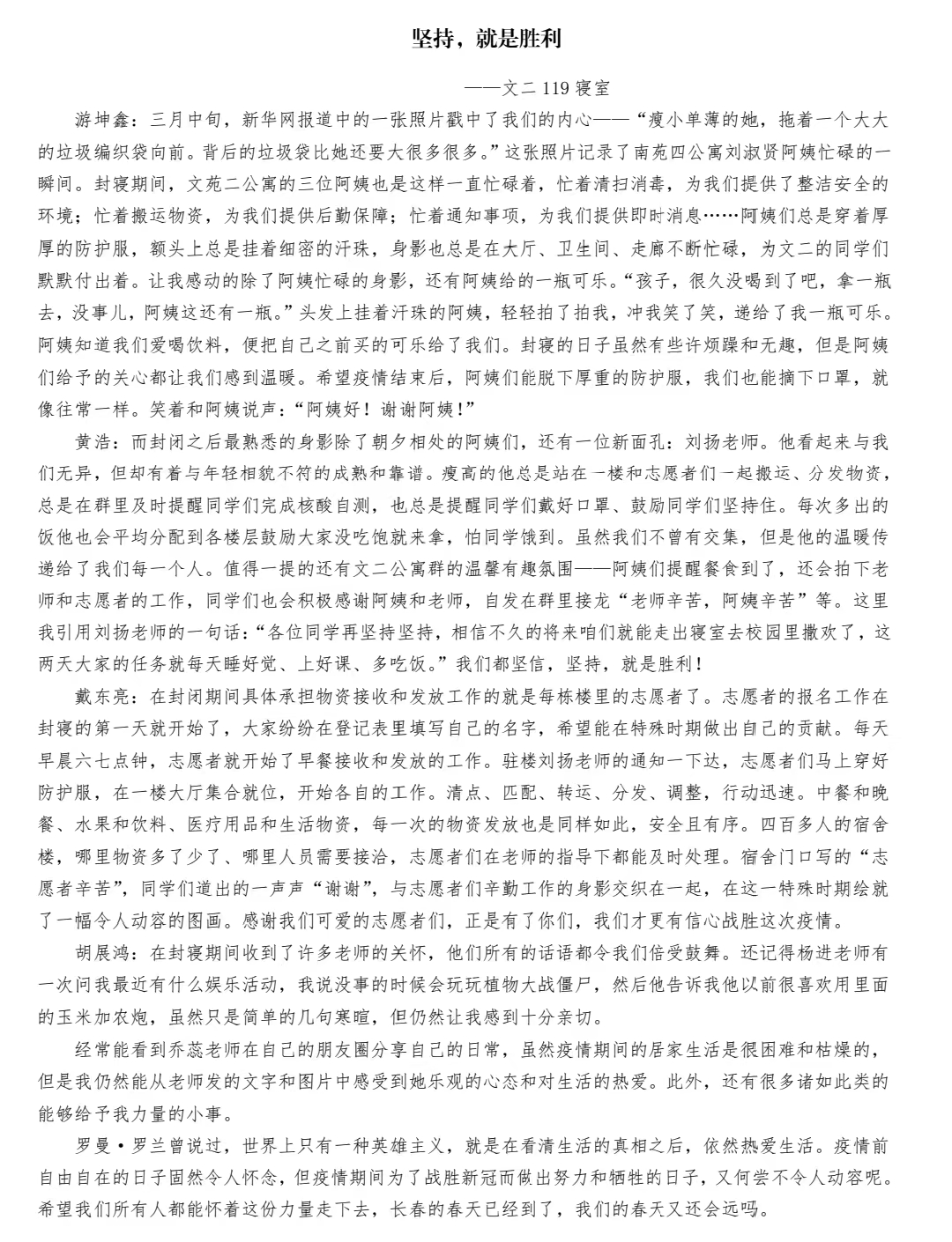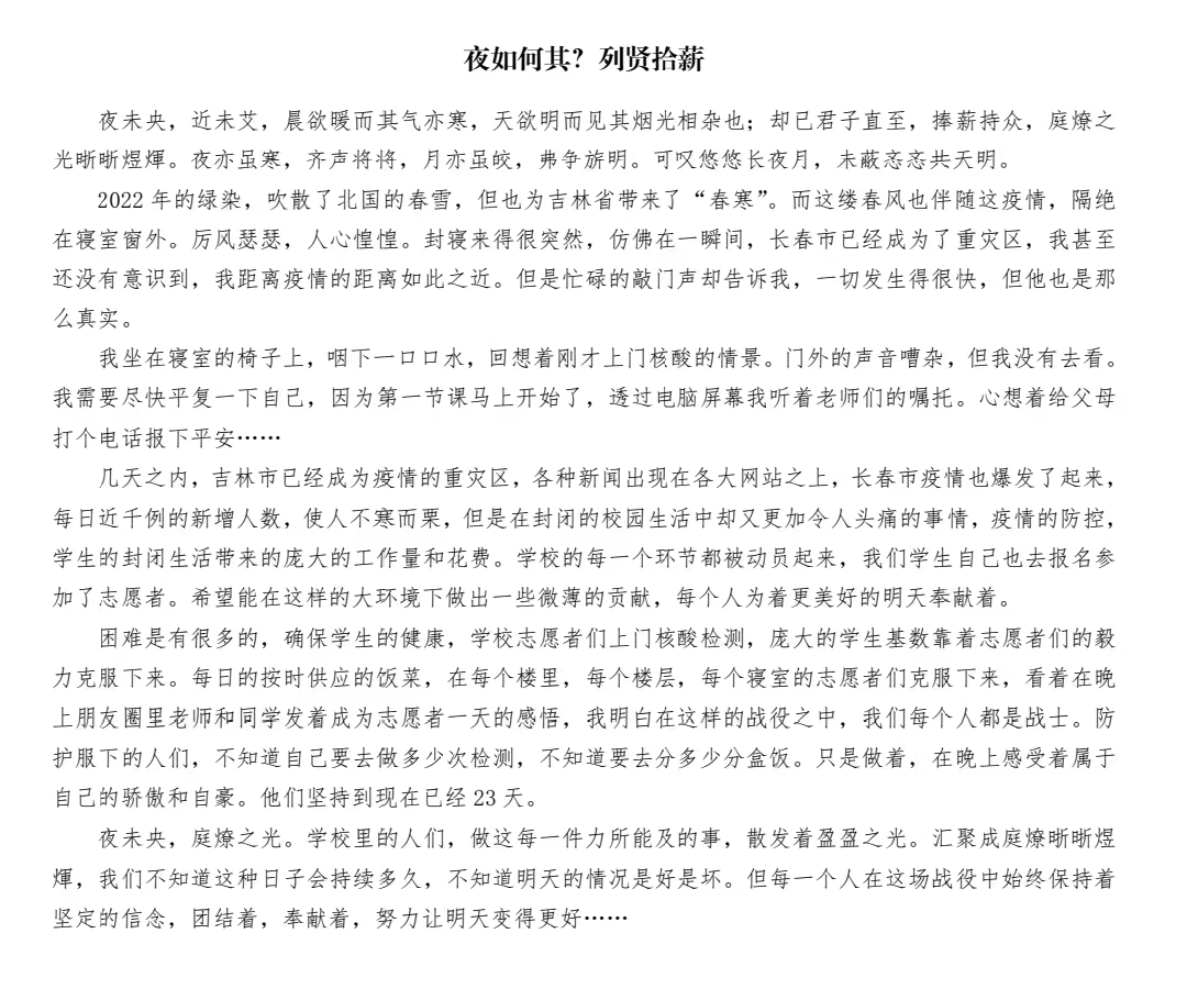 此次活动中,同学们积极响应,纷纷落笔,书写下了自己的见闻和感悟。札记虽短,却诉说着同学们内心中最真挚的情感;冬季虽长,却总有春暖花开的季节。在本次征文活动中,各年级同学们热情参与,用真诚且细腻的语言讲述着自己的经历与感受,充分表达了对所有奋斗在抗疫一线的人们的谢意和对战疫胜利的信心,展现了英国威廉希尔唯一官网学子热忱赤诚的家国情怀和积极阳光、奋发向上的青年风采。