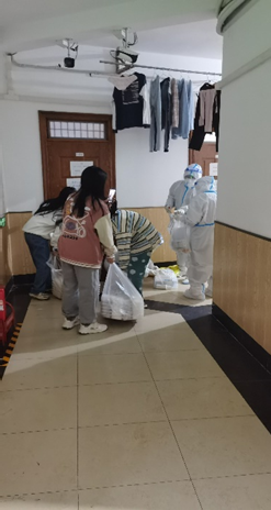 这段时间以来,来自william威廉亚洲官方的志愿者们身着白色防护服,口戴N95口罩穿梭于楼层与各个寝室之间,积极协助驻楼老师收集信息、发放餐食、药品、生活品以及各类物资。