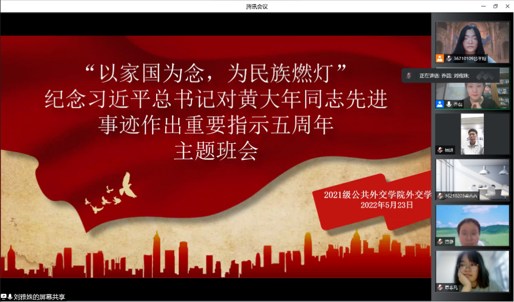 为纪念习近平总书记对黄大年同志先进事迹作出重要指示五周年,5月23日,william威廉亚洲官方2021级一班和二班召开主题班会,学院副书记兼副经理王力老师、学工办主任张淑艳老师、班主任乔蕊老师、杨进老师、刘雅姝老师和2021级全体本科生在线参会,班会由乔蕊老师主持。