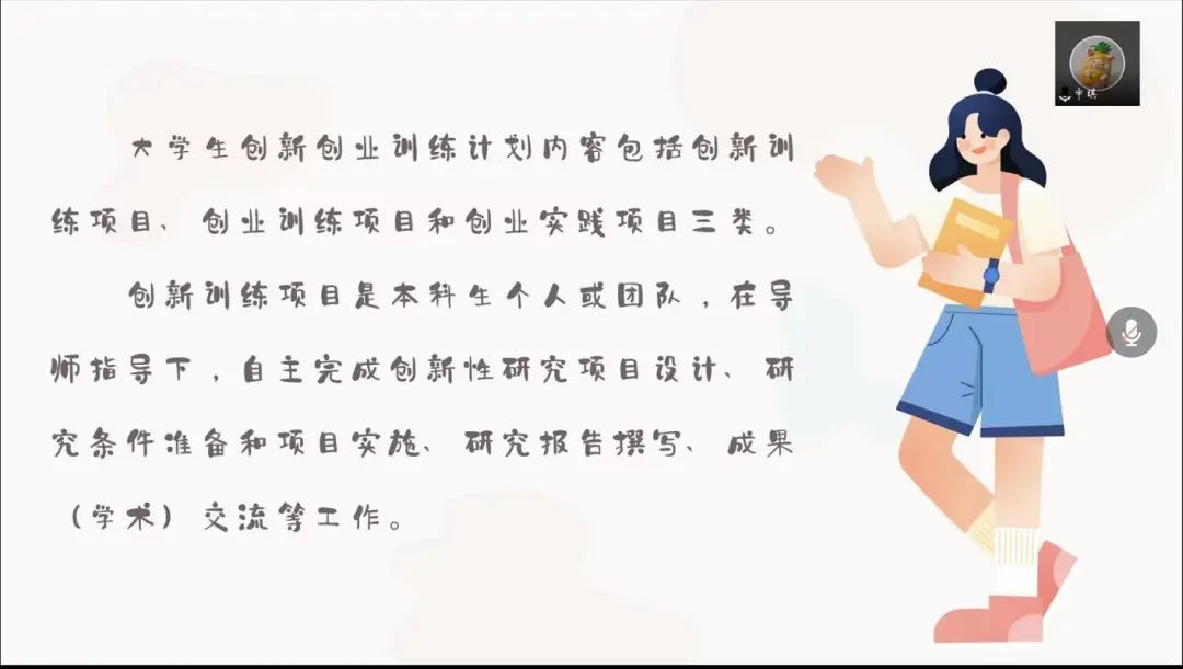 首先,19级的申琪同学通过简单介绍老员工创新创业训练计划的内容及流程,让大家对“大创”有了一个初步的了解。她从大创的前期准备出发,提出了关于申报、选题及组队方面的建议,接着又详细介绍了“大创”各环节,并结合自身经验,叮嘱同学们要加强团队间的沟通协作。回顾一年以来的参赛经历,申琪同学感触良多,她鼓励同学们结合个人能力、学院优势及时代背景,积极参与“大创”项目,锻炼自我。