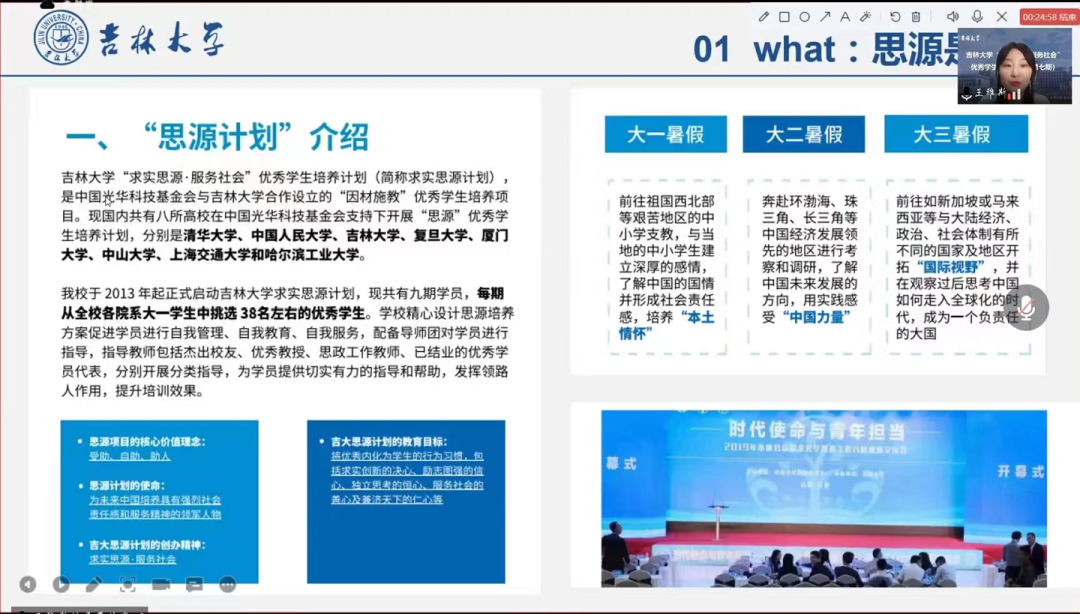 接着,来自商学院18级的王雅斯同学向大家介绍了思源计划的具体内容。她从“思源是什么”讲起,重点阐述了加入思源的初心,向大家分享了自己在选拔、面试中的经验与感悟。提及思源“受助、自助、助人”的核心理念,她鼓励大家在认真学习的同时积极开拓视野、锻炼自身能力。在学姐细致入微的讲解下,大家对于即将到来的培养计划选拔有了较为清楚的认知,也更加明白创造力、责任感在学习中的重要性。