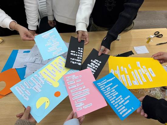 热身环节后,活动进入拼贴与展示环节。在这一环节中,大家随机选取打印好的诗歌素材,凭借自己天马行空的想象力将素材剪下或撕碎,最终将其变成能够表达自己近期情绪的“拼贴诗”。最后,大家交流分享自己创作的灵感和参与本次活动的心得体会,活动在大家的欢声笑语中圆满结束。