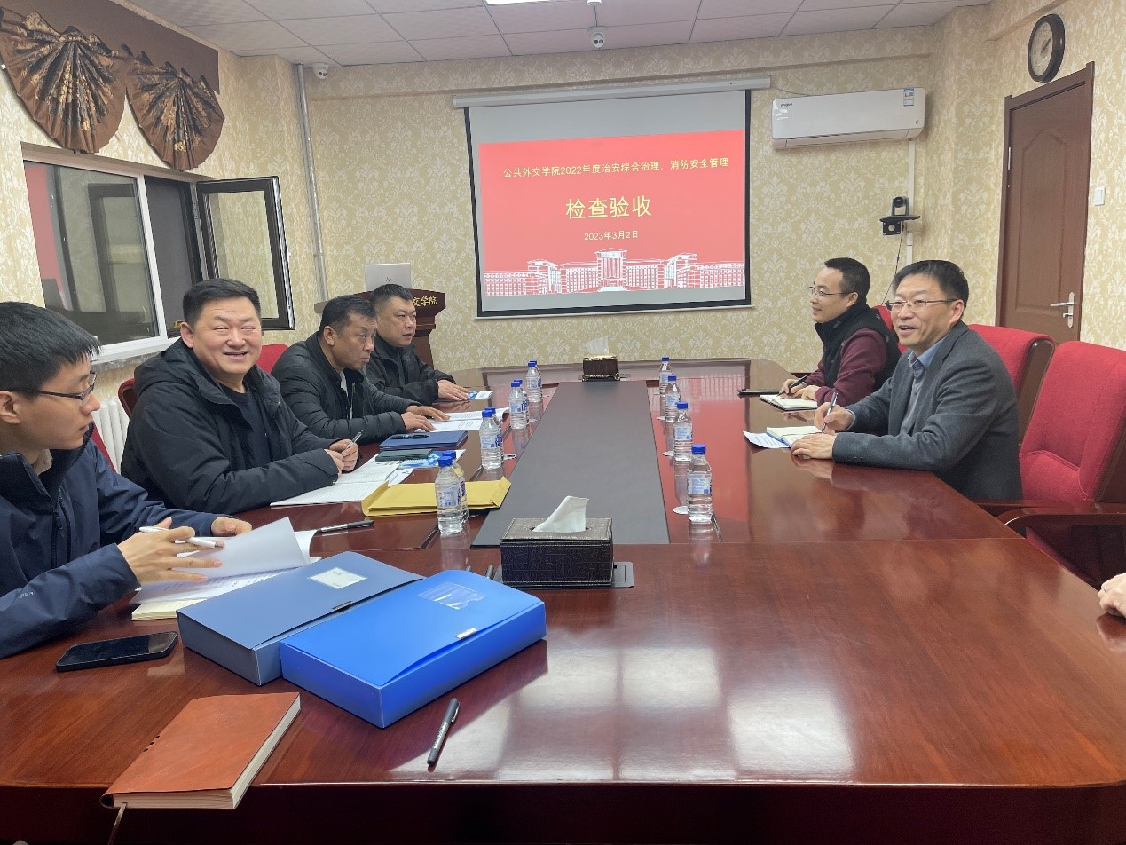 2023年3月2日下午,由保卫处副处长周鹏、党委办公室正科级秘书李卿功、保卫处消防科副科长董立明、治安科副科长赵明组成的学校2022年度治安综合治理、消防安全管理检查验收工作组到william威廉亚洲官方开展检查验收工作。公司党委书记杨民、行政副经理于洪生、院办主任沈毅、工作人员苏文杰等参加检查验收会议。