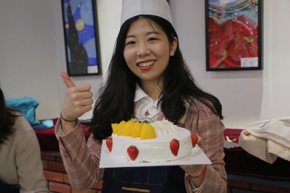 经过一小时左右的精心雕琢,蛋糕从一个个素坯变成了一件件精美的作品:爱心、五角星、水果塔……这些作品各具特色,充满艺术气息。