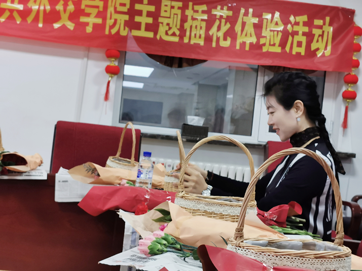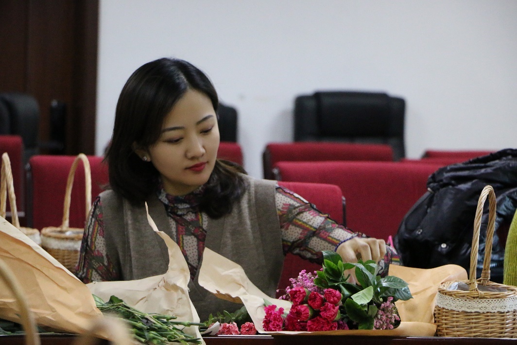 活动伊始,在学院行政楼大会议室沁人心脾的花香中,周老师向参与活动的教师介绍了插花的发展历史,普及了鲜花和家庭盆栽的养护知识,详细讲解了插花的要领及技法,并进行了插花演示。置身于鲜花丛中的老师们兴致盎然,认真聆听老师讲解。