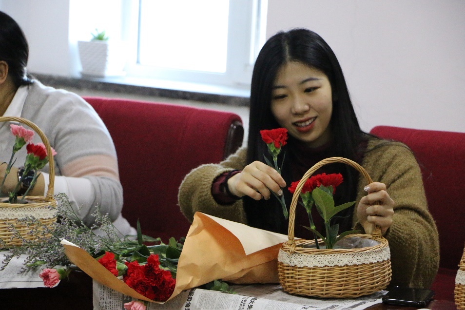 与此同时,学院妇委会为参加培训的教职工精心备好了插花材料:花篮、剪刀、洋牡丹、非洲菊、玫瑰花、满天星、尤加利叶、雪叶莲……教师们在周老师的指导下认真修剪,精心构思,尽情地发挥创作力,根据不同的色彩、形状,错落有致、色彩纷呈地将花材搭配在一起,变成了一件件具有艺术感、层次感的精美作品。